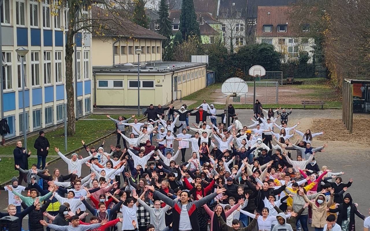 In Essen haben 300 Kinder aus Altenessen am Freitag (9. Dezember) einen Flashmob an der Parkschule gemacht. Alle waren dabei, von der ersten bis zur zehnten Klasse.
