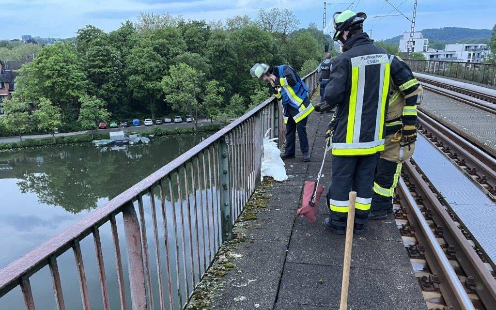 In Essen hatten am Sonntagabend (14. Mai) mehrere Passanten gegen 20:45 einen verunfallten Schwan auf der Ruhrtalbrücke in Kettwig gemeldet. Das Tier hat sich mutmaßlich im Landeanflug auf den Stausee verrechnet und ist dabei mit dem Brückengeländer kollidiert, bzw. darin stecken geblieben. Zusammen mit der freiwilligen Feuerwehr erreichten Bundespolizisten wenig später die Eisenbahnbrücke. Die Polizisten sperrten zunächst die Bahnstrecke zwischen Essen-Kettwig und Essen-Hösel, damit die Einsatzkräfte ungefährdet dem Schwan Hilfe leisten konnten. Dort stellten sie fest, dass er sich er sich unmöglich selbst aus dieser misslichen Lage hätte befreien können. Circa 20 Minuten später war es den Rettungskräften gelungen, den gefiederten Freund zu retten.