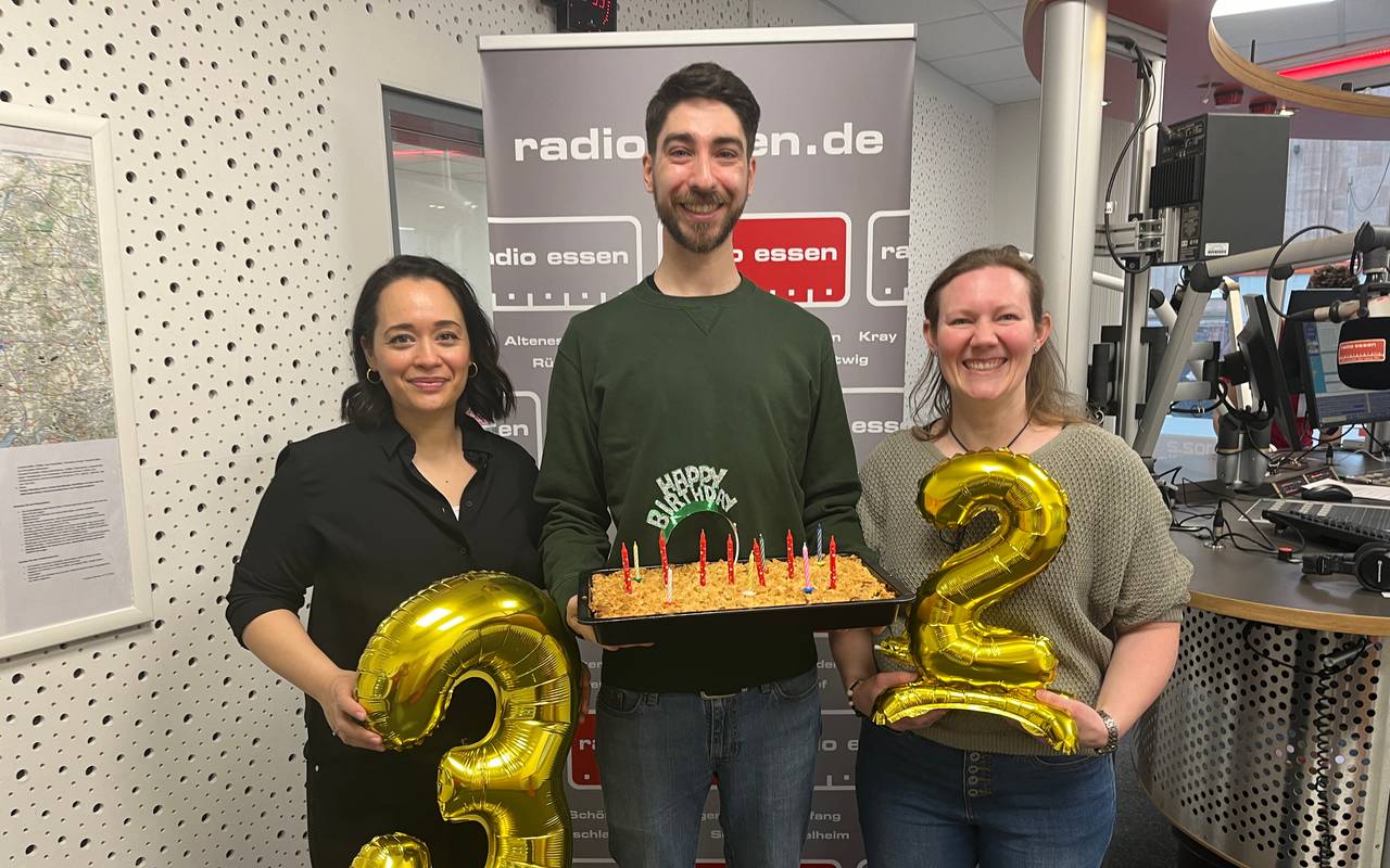 "Beate aus Heisingen, Eileen aus Rüttenscheid und Robin aus Holsterhausen - das sind die Top 3 der Aktion "Essens beste Stimme". Die Gewinnerin steht nach dem Finale am 1.4. (live bei Radio Essen) fest: Eileen Milenk. Und nach fünf harten Aufgaben gab es noch einen Pflichttermin: Podcast-Interview mit etwas Sprechübungen bei "Essen im Ohr". Es ist der erwartet chaotische Podcast direkt nach drei Stunden Spiel und Aktion, neben dem am Sendergeburtstag schon leicht überforderten Host Christian Pflug kommentierten Radio-Essen-Stadtreporterin Julia Crüsemann und Frühschicht-Moderator Joshua Windelschmidt quasi von der Seitenlinie zugeschaltet aus dem Nachbarstudio.