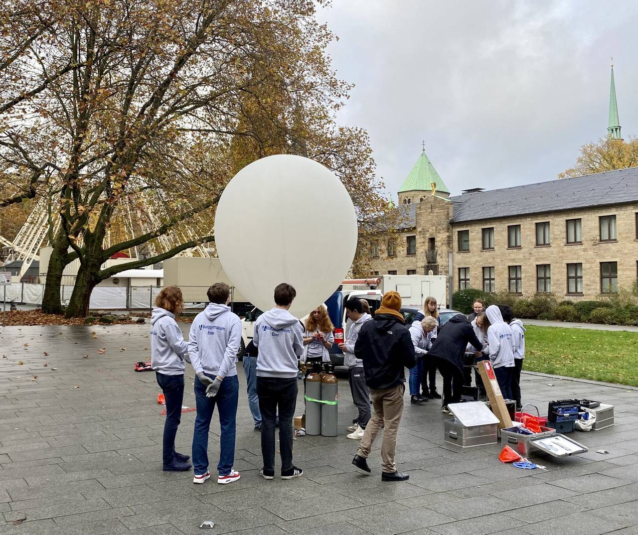 Am Mittwoch (15. November) wurde in Essen ein Ballon Richtung Weltall geschickt und damit ein Forschungsprojekt des Burggymnasiums gestartet. Der Ballon ist am Mittag in der Nähe von Kassel gelandet und wurde geborgen. Er ist ca. 40 Kilometer hoch gestiegen, und etwa 240 Kilometer weit geflogen. Das Gymnasium hat in Kooperation mit dem Marketingunternehmen Stratoflights den Ballon um 10:15 Uhr aus der Innenstadt in die Stratosphäre geschickt. Das hat im August auch schon die Gertrud-Bäumer-Realschule aus Altenessen gemacht. An dem heliumgefüllten Wetterballon hängt eine Sonde und Kameras. Der Ballon steigt etwa 40 Kilometer hoch, dehnt sich aus und platzt. Die Sonde mit den Messgeräten fällt herunter und wird eingesammelt. Das Videomaterial und die Messdaten werten die Schülerinnen und Schüler dann aus. Die Videos werden auch auf der Internetseite der Schule hochgeladen.