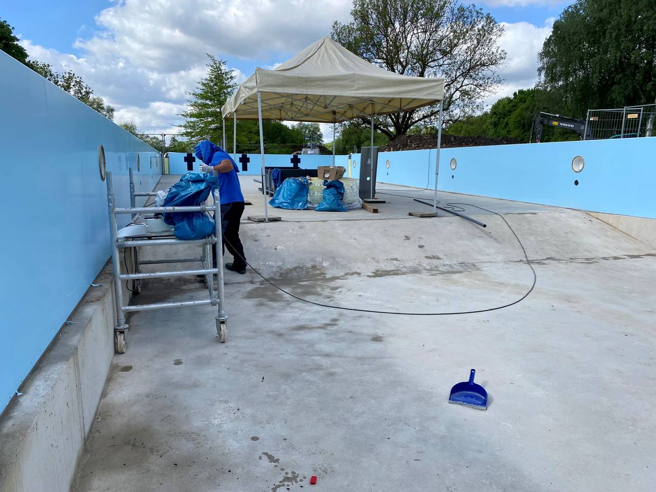 Das neue baby-blaue Edelstahlbecken in Essen kann nach einem Hochwasser, oder auch zum Saisonbeginn ganz einfach geputzt werden. Mit einem Hochdruckreiniger wird der Dreck ganz einfach weggespült. Fliesen sind viel schwieriger zu reinigen und gehen oft bei Frost im Winter kaputt.