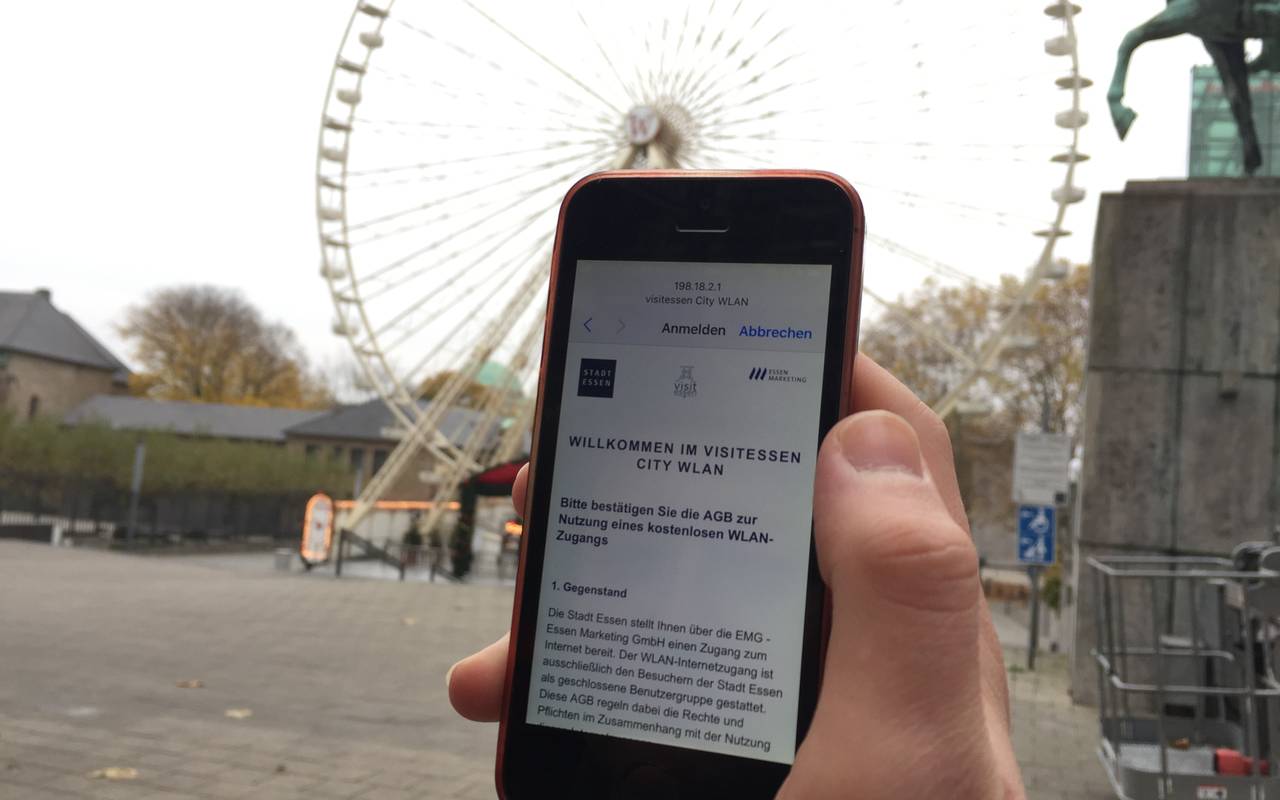 Mit der Eröffnung des großen Weihnachtsmarkts in der Innenstadt startet auch das freie WLAN. Wer sich unter dem Namen „visitessen City WLAN“ anmeldet, kann ab sofort auf dem Kennedyplatz und dem Burgplatz kostenfrei im Internet surfen. Unser Radio Essen-Stadtreporter hat das WLAN am ersten Tag getestet. Am Nachmittag lief es störungsfrei und schnell. Da war aber die Innenstadt auch noch nicht so voll. Sobald das Handy nicht mehr direkt auf dem Burgplatz oder Kennedyplatz ist, ist das WLAN weg. In den Nebenstraßen kann es also nicht genutzt werden.