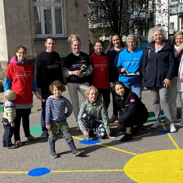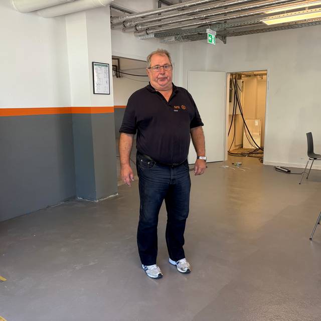 Zwei Strahler leuchten den Wasserturm an. Sie sind am Zaun um den Wasserturm befestigt. Ein dritter Strahler leuchtet auf einen Baum vor dem Wasserturm. Die Farben passen sich an die Temperatur an. Je kälter es ist, desto grüner ist die Farbe. Wenn es wärmer wird, ist die Farbe rot. Das Konzept funktioniert über spezielle Messgeräte, die die Temperatur erfühlen.