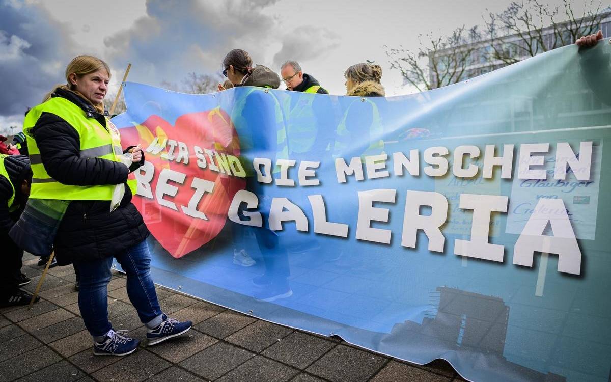 Am Rande der Gläubigerversammlung in der Messe haben Betriebsräte aus ganz Deutschland am Montag (27. März) einen symbolischen Sarg aufgebaut. Er war mit Schildern bedeckt, auf denen die Namen der aktuellen Schließungsfilialen stehen. Galeria-Betriebsrätin Pamela Werner legte den Finger in die Wunde, als sie klarmachte: "Auch die, die bleiben, wissen nicht: Ist das jetzt wirklich für die Zukunft gemacht oder stehen wir vielleicht in ein zwei Jahren wieder hier."