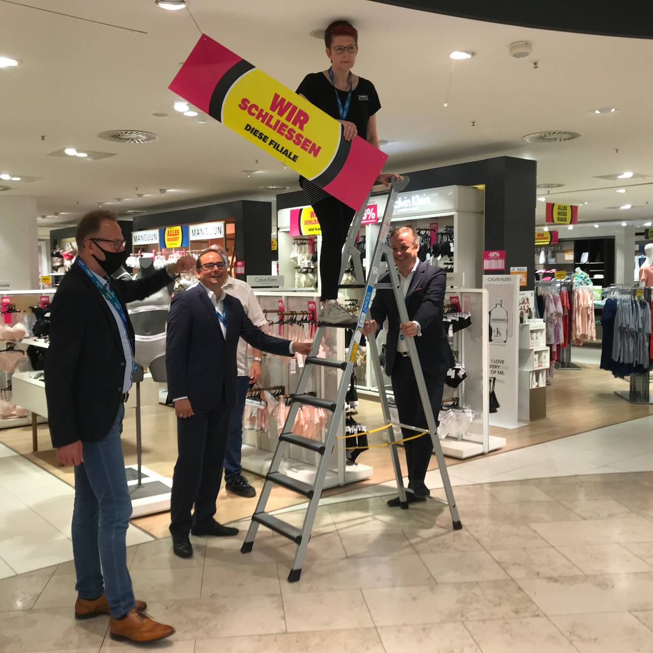 "Wir schließen...NICHT" freut sich Oberbürgermeister Thomas Kufen auf seiner Facebookseite. Er hatte die Infos offenbar schon früher, denn er schreibt er hat sie der Belegschaft am Dienstagmorgen zusammen mit dem Konzernchef selbst mitgeteilt. Auf dem Foto dazu nimmt eine Mitarbeiterin das Schild ab, auf dem noch auf die Filialschließung hingewiesen wird. Am Montag habe es nach harten Verhandlungen eine Einigung mit dem Vermieter gegeben, schreibt Kufen. Dafür bedankt er sich bei allen Beteiligten, insbesondere bei den Mitarbeitern, den Betriebsräten und der Geschäftsführung. Sie alle hätten die Karstadt-Filiale im Limbecker Platz nie aufgegeben.