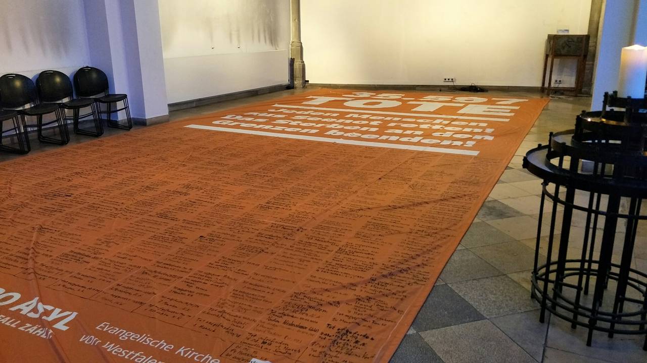 Zum Oktober beginnen die Gedenk- und Mahnwochen der evangelischen Kirche bei uns in Essen. Dafür wurde an der Marktkirche in der Innenstadt ein großes oranges Banner aufgehängt. Es wird am Montagabend gegen 18 Uhr enthüllt. Darauf stehen tausende Namen von Flüchtlingen, die im Mittelmeer ertrunken sind. Unter dem Motto "Jeder Mensch hat einen Namen" ist im Sommer das Banner auf dem Kirchentag in Dortmund entstanden. Das hat aber gar nicht ausgereicht. In der Marktkirche liegt noch ein zweites Banner mit vielen weiteren Namen toter Flüchtlinge. Zur Enthüllung der Banner gibt es eine Andacht und eine Kundgebung der Kirche. Superintendentin Marion Greve hat schon angekündigt, dabei heftige Kritik an der Politik zu üben. Es könne nicht sein, dass immer noch Menschen auf dem Mittelmeer sterben. Auch Domprobst Thomas Zander unterstützt die Gedenk- und Mahnwochen.