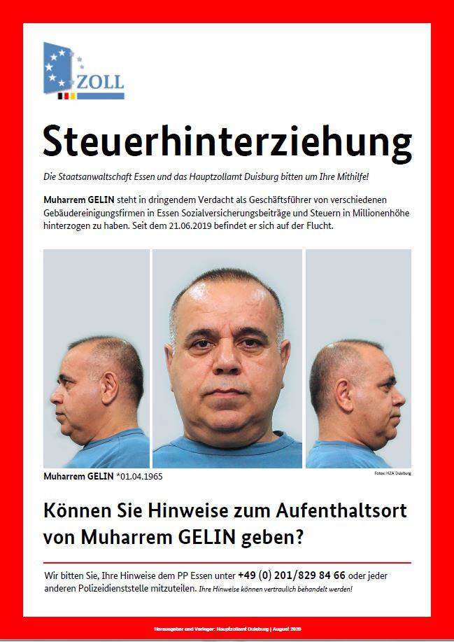 Es besteht der dringende Tatverdacht, dass Muharrem Gelin als Geschäftsführer von verschiedenen Essener Gebäudereinigungs-Firmen Sozialversicherungsbeiträge und Steuern in Millionenhöhe hinterzogen haben soll. Seit dem 21. Juni 2019 ist er auf der Flucht. Hinweise zum Aufenthalt des Tatverdächtigen nimmt die Polizei Essen, Tel. 0201/ 829-8466 sowie jede andere Polizei-Dienststelle entgegen. Eine öffentliche Suche mit Fotos nach einem Steuerbetrüger ist sehr selten, heißt es von der Staatsanwaltschaft. Auch die Wirtschaftskammer am Essener Landgericht befasse sich mit dem Fall.