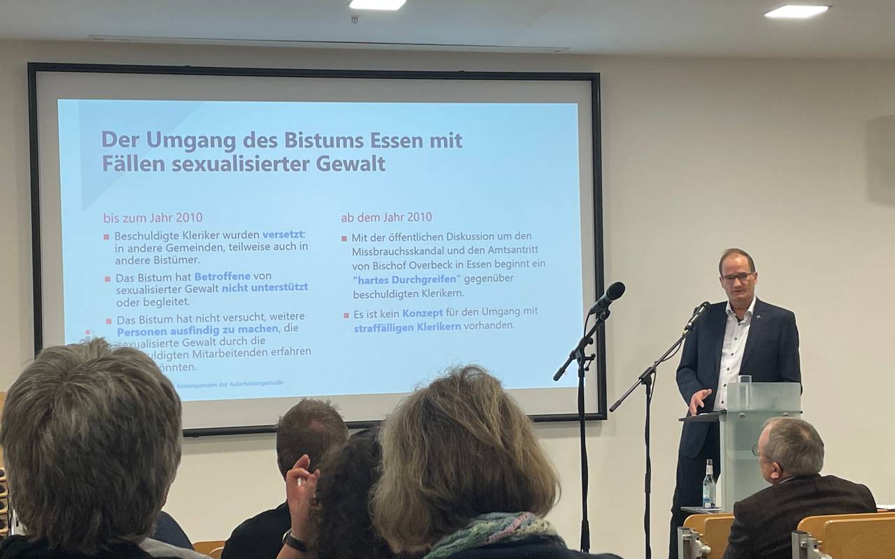 Mit Gläubigen über sexualisierte Gewalt in den Kirchen bei uns in Essen reden - darum ging es bei einer Veranstaltung des Bistums am Donnerstagabend (23.März) in der Volkshochschule. Hintergrund war eine aktuelle Studie, die zeigt, wie das System Kirche Missbrauch begünstigt und Täter schützt. Die Studie gibt rund 90 Empfehlungen mit Lösungen für die Kirche, damit sexueller Missbrauch in Zukunft verhindert wird. Unter anderem sollen Schutzkonzepte überarbeitet und Gemeindemitglieder für das Thema sensibilisiert werden. Aber auch in der Priesterausbildung muss sich etwas ändern. Zum Beispiel sollte offener mit Sexualität umgegangen werden - angefangen bei den Priestern selbst. Das sieht auch Generalvikar Klaus Pfeffer so, der die Studie am Donnerstag vorgestellt hat.