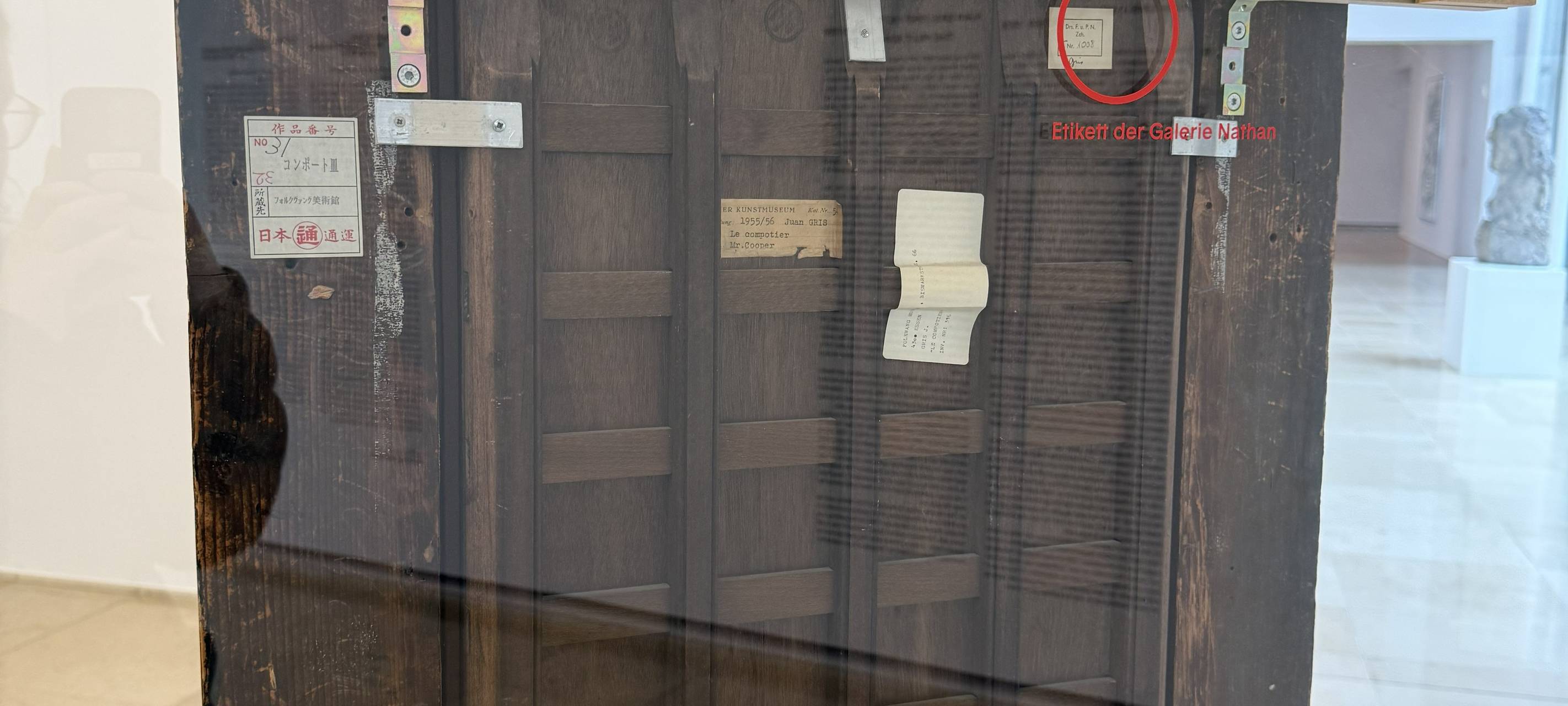 Fällt das in die NS-Zeit oder Kolonialisierung, sucht Heitmann-Taillefer in der Werkstatt nach weiteren Spuren. Heitmann-Taillefer erklärt, dass viele Museen nicht wissen, wo sie mit der Provenienzforschung anfangen sollen. Der erste Schritt für viele Museen sind dann die Gemälde, weil schon ihre Rückseiten erste Hinweise geben. Die untenstehenden Bilder zeigen die Vorder- und Rückseite eines Gemäldes, das im Provenienzraum des Museum Folkwang ausgestellt ist. Ernst Heckel malte "Spaziergänger am Grunewaldsee" im Jahr 1911.