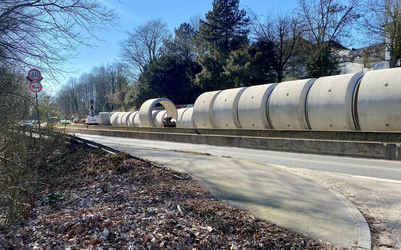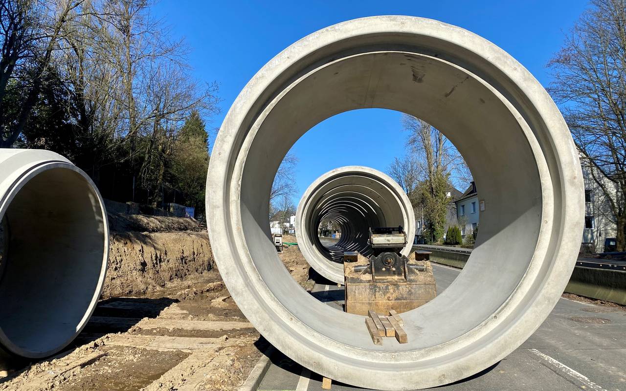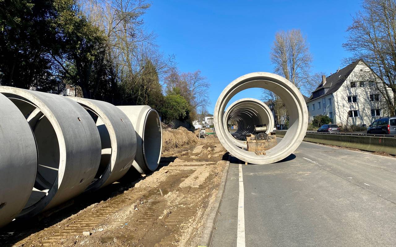 Die Großbaustelle auf der B 224 in Essen dauert bis zum Herbst. Die Stadtwerke verlegen dort riesige Betonröhren, die das Regenwasser zurückhalten sollen.