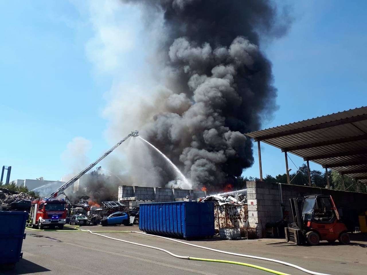 Dienstagmittag (23. Juli) bricht ein Großbrand auf einem Recyclinghof in Bergeborbeck aus. Alte Matratzen, Teppiche und Schrottfahrzeuge brennen, die dunkle Rauchsäule ragt kilometerhoch in den Himmel und ist bis nach Oberhausen zu sehen. Die Nachlöscharbeiten ziehen sich weit in den nächsten Tag.