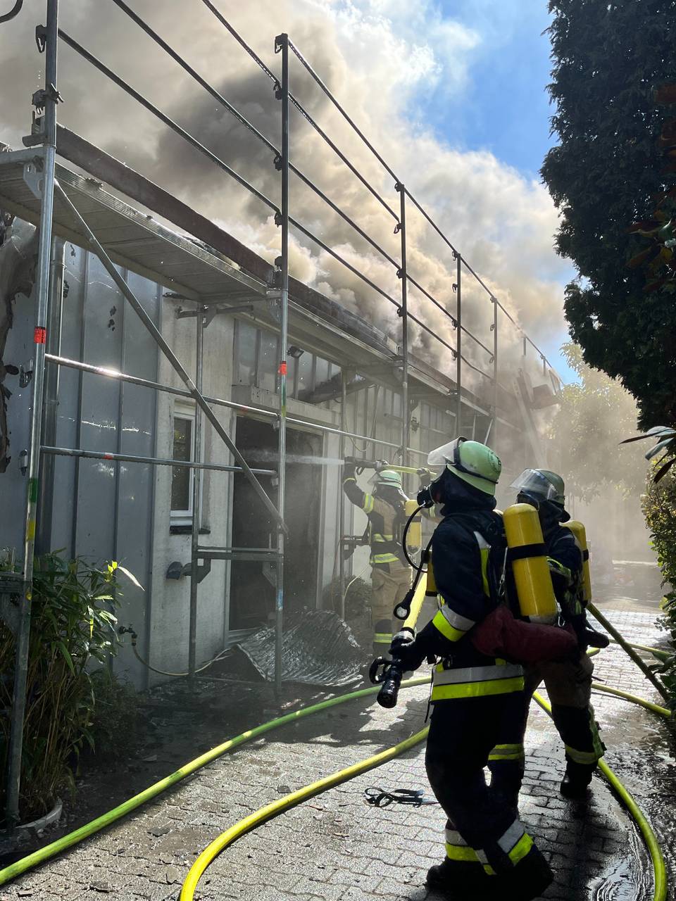 Meterhohe Flammen schlagen in die Höhe, die dunkle Rauchwolke ist über der ganzen Stadt zu sehen, die Warnapp NINA schlägt Alarm. Das Feuer in der Lagerhalle eines Malerbetriebs hat am Dienstagnachmittag für einen großen Feuerwehreinsatz gesorgt. Handwerker haben am Dach der Halle gearbeitet und dabei offenbar den Brand ausgelöst. Sie haben noch versucht, das Feuer selbst mit einem Feuerlöscher in den Griff zu bekommen. Das war vergeblich. Das Feuer hat sich schnell auf rund 200 Quadratmeter des Hallendachs ausgedehnt. Die Feuerwehr hat daraufhin sofort praktisch alle verfügbaren Kräfte mobilisiert.