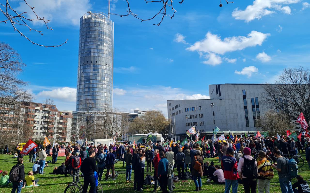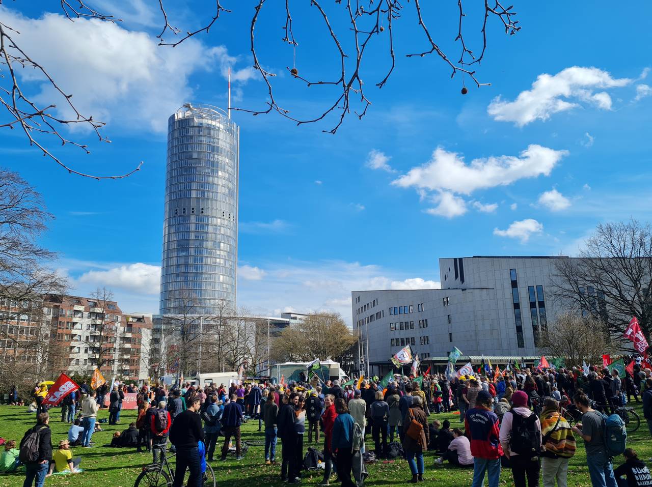 Mit weitgehend friedlichem Protest setzen die Demonstranten am Samstag ein Zeichen für mehr Umweltschutz und Zukunftsperspektiven. Mit Blick auf den RWE-Turm ging die Klima-Demo am Samstag Mittag (18.März) im Stadtgarten los. Knapp 1000 Menschen waren bei der symbolischen Blockade vor der RWE-Zentrale im Nordviertel dabei, darunter verschiedene Bündnisse, die sich auch schon bei der Räumung von Lüzerath politisch engagiert haben. Die Protestaktion verlief friedlich und ohne Zwischenfälle. Sowohl bei der Auftaktkundgebung im Stadtgarten als auch bei der Abschlusskundgebung gab es viel Programm verschiedener Redner und Musiker, unter den Teilnehmenden waren viele Familien mit Kindern und junge Menschen.