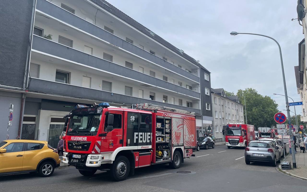 Mehrere Menschen stehen an Fenstern und auf den Laubengängen vor ihren Wohnungstüren und schreien um Hilfe. Im Keller brennt es und das Treppenhaus ist stark verraucht. Ohne Ausrüstung ist da kein Durchkommen. So ist die Situation an einem Mehrfamilienhaus auf der Kölnerstraße beim Eintreffen der Feuerwehr am Mittwochmorgen (10. September) gegen 05:30 Uhr. Die Einsatzkräfte haben fast 40 Menschen über Drehleitern gerettet. Sie befinden sich laut Feuerwehr in einer Patientenablage. Dort werden sie durchgecheckt. Verletzt wurde nach aktuellem Stand niemand, einige Personen haben Rauchgas eingeatmet. Die Einsatzkräfte haben das Feuer unter Kontrolle und haben mit den Nachlöscharbeiten begonnen. Im Keller des Hauses wird ein spezieller Löschschaum eingesetzt, um die Glutnester zu bekämpfen. Im ganzen Haus musste erstmal zur Sicherheit der Strom abgestellt werden. Im Erdgeschoss des Mehrfamilienhauses befindet sich ein Lebensmittelgeschäft.