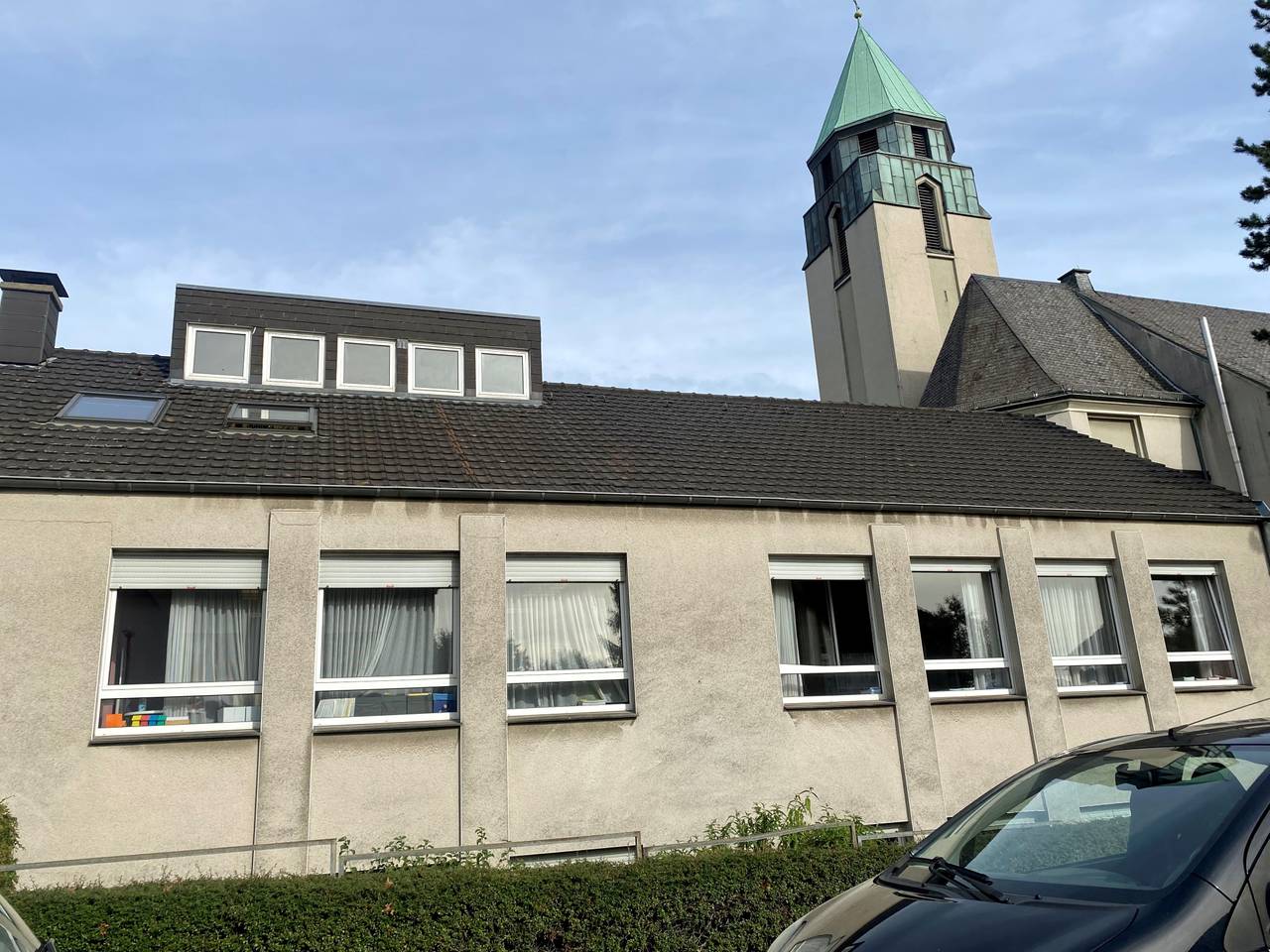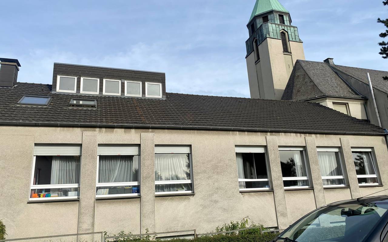 Der Schulhof der Eichendorffschule (Teilstandort an der Heißener Straße 49 – "Rote Schule“) in Essen ist eine Baustelle. Überall liegen Schotterhaufen, am Zaun sind matschige Löcher im Boden. Das Problem: Der Hof ist der einzige richtige Zugang ins Gebäude. Deshalb können die Kinder nicht ins Gebäude kommen. Seit Montag (16. Oktober) haben sie Unterricht im Gemeindeheim St. Antonius Abbas. Das Gemeindehaus ist nur einen Kilometer von der Schule entfernt.