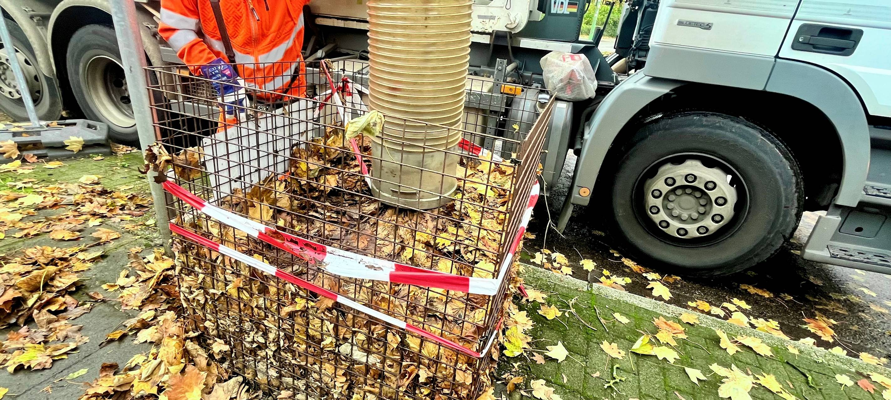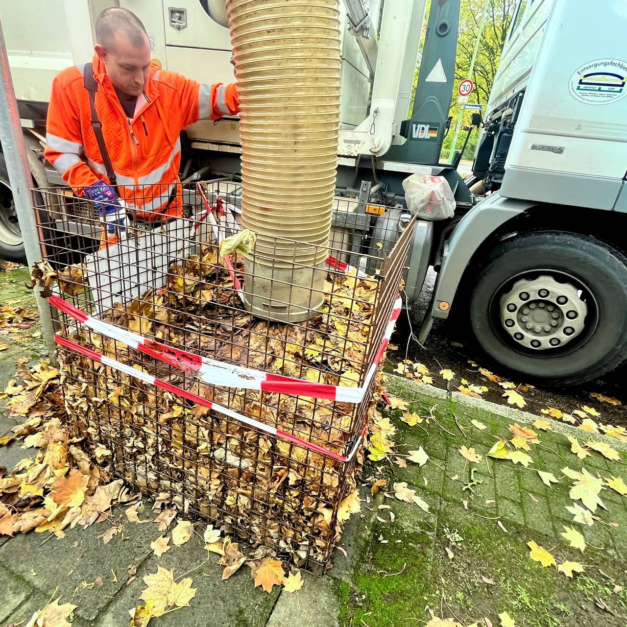 Damit die Straßen schnell frei werden, sind in Essen die großen Saug-LKW unterwegs. Sie nehmen direkt vom Straßenrand oder aus den Körben das Laub auf.