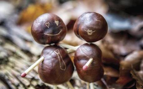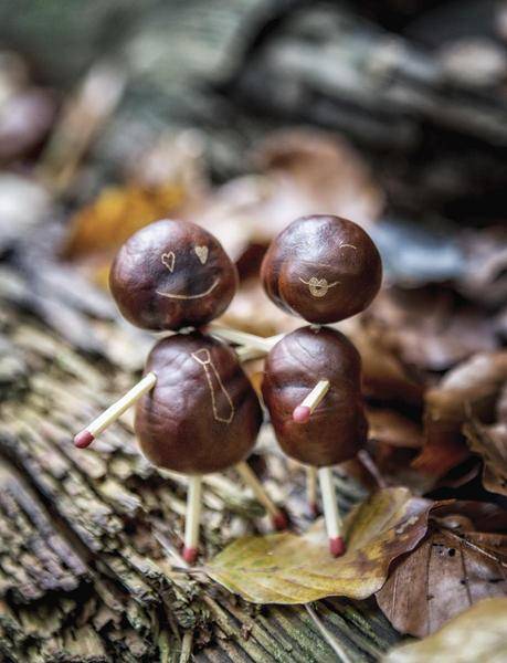 Kastanienfiguren sieht man jedes Jahr auf den Fensterbänken in Essen. Es gibt natürlich die Klassiker, bei denen man kleine Löcher in die Kastanien bohrt und Streichhölzer hineinsteckt und die Figuren dann noch bemalt. Mit Federn kann man aber auch noch Haare ankleben oder man bastelt neue Figuren. Zum Beispiel eine Kastanien-Schlange. Dafür durchbohrt man die Kastanien komplett und führt einen Faden durch die Löcher und verbindet die Kastanien so. An die vordere Seite der Schlange fügt man dann noch einen Kopf dazu. Dafür bohrt man nur zur Mitte der Kastanie und verbindet den Schlangenkörper durch ein Streichholz mit dem Kopf.