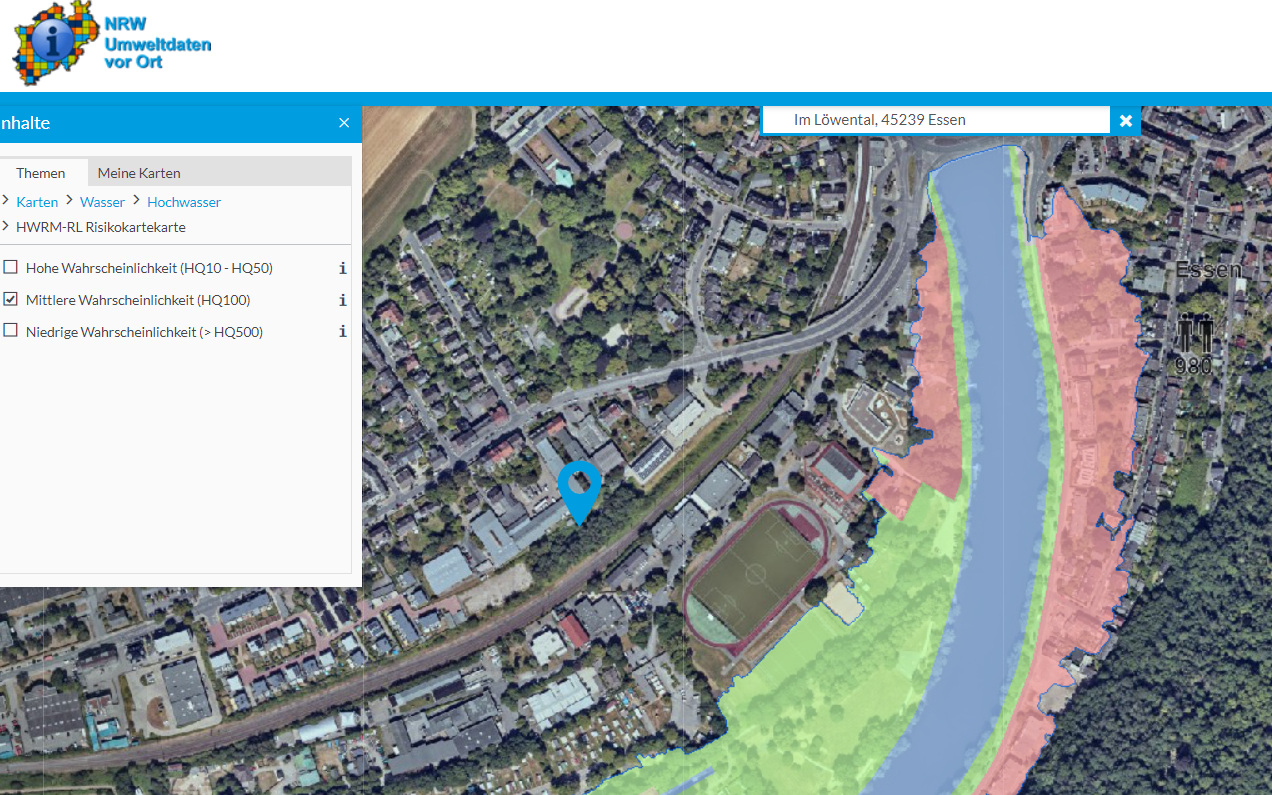 Die Hochwassergefahrenkarte des Landes findet Ihr auf www.uvo.nrw.de. Dort gebt Ihr Eure Adresse ein, klickt links im Menü auf Karten, Wasser, Hochwasser und den aktuellen Gefahrenbereich (HWRM-RL Risikokartekarte), das ist aktuell die mittlere Wahrscheinlichkeit. Die Karte zeigt entlang der Ruhr grüne und rote Bereiche an, grüne Bereiche sind gefährdete bepflanzte Bereiche, rote Bereiche sind Wohngebiete.