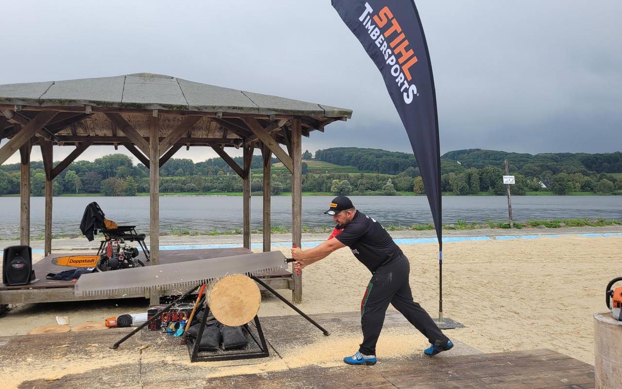 Sportholzfäller-Meister Danny Martin stellt seine Kraft in Essen vor.