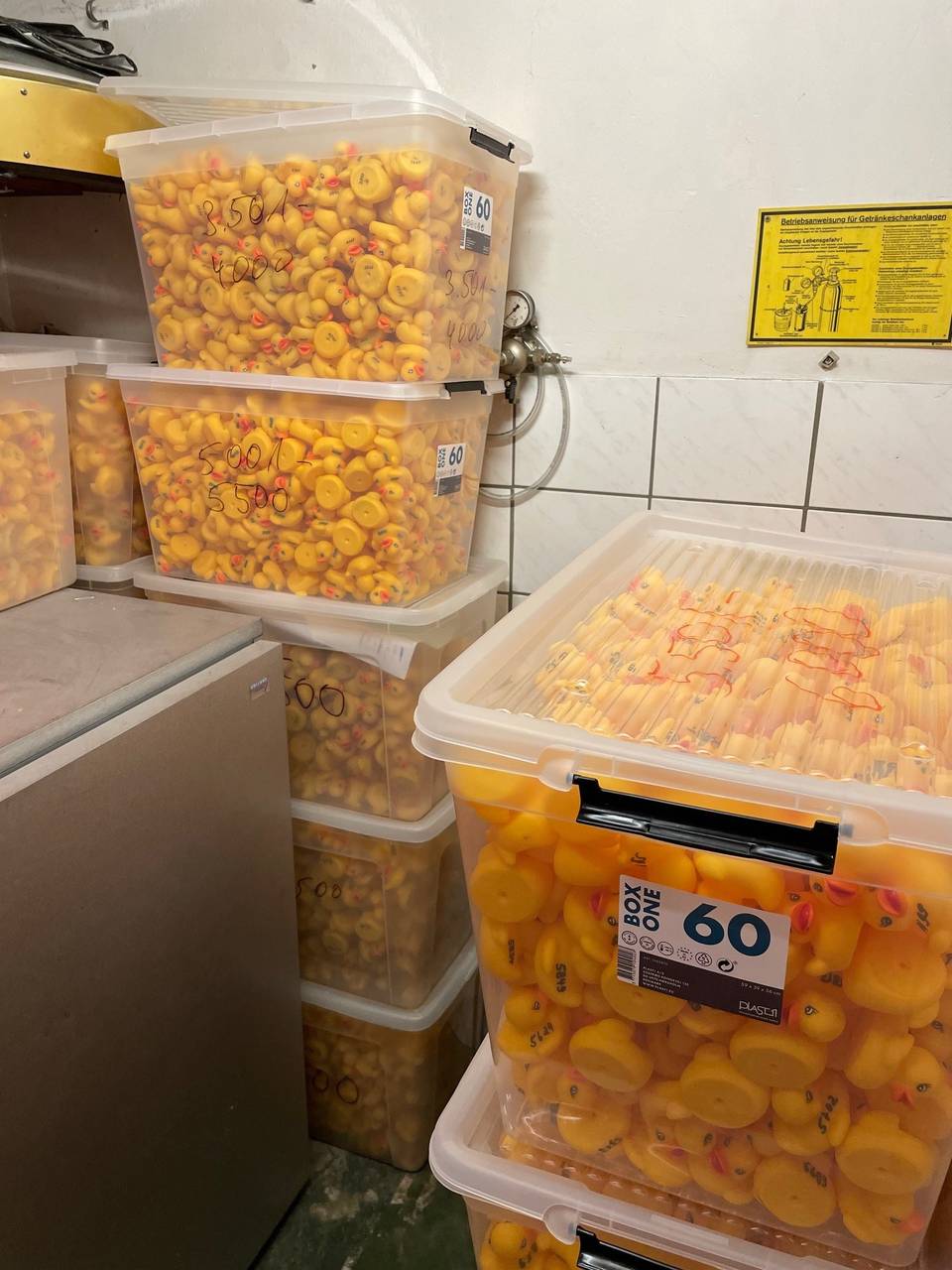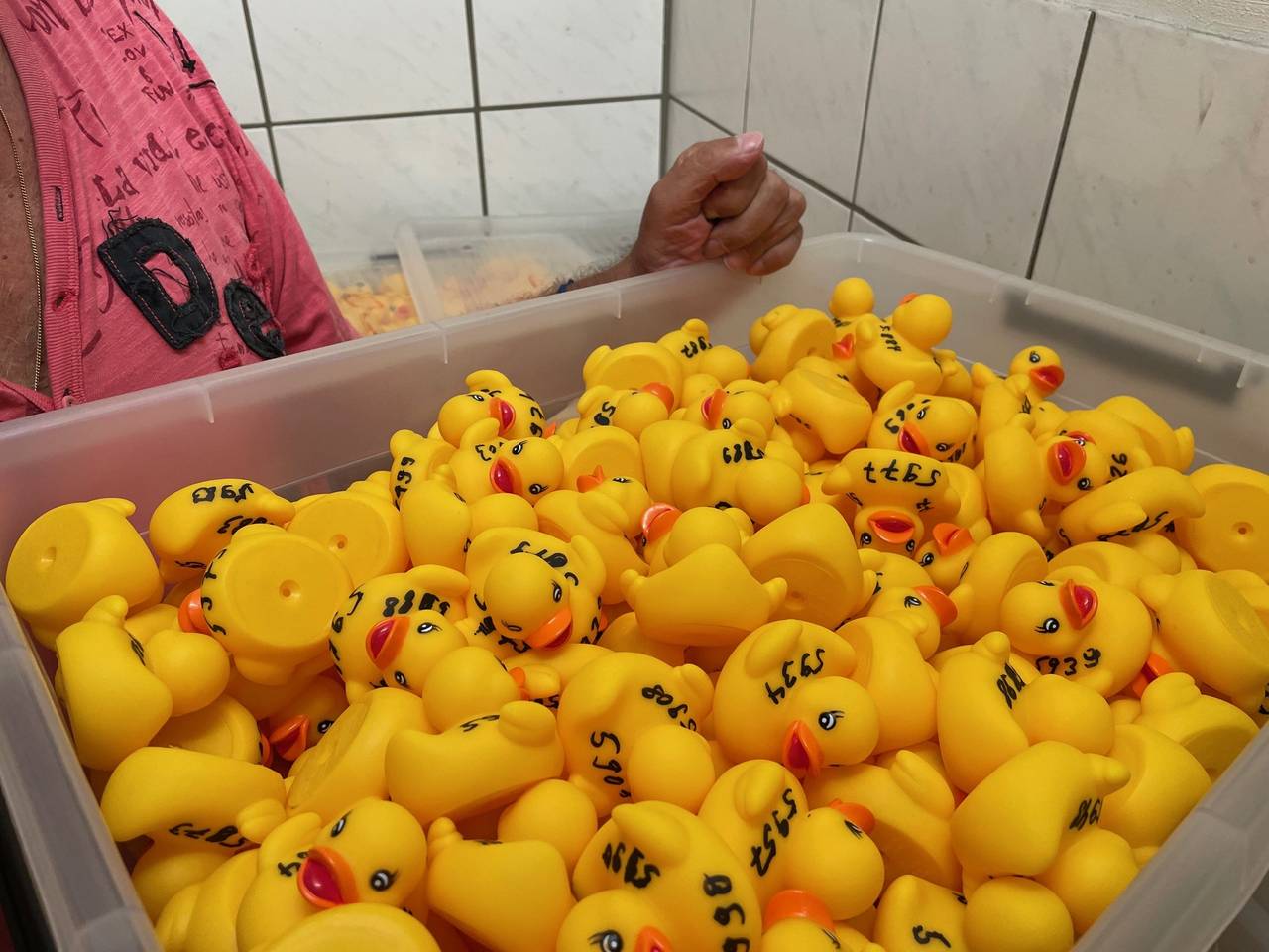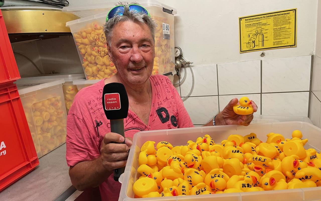 Noch lagern die 7777 Enten fein säuberlich nach ihren Startnummer sortiert in 17 großen Kisten im Lager von Steele 11. Das ändert sich am Mittwoch (28.08.24) um 20:30 Uhr. Dann werden alle gelben Plastikenten ins Schwimmbecken des Freibades an der Ruhr geschüttet und von einer "Enten-Trainerin" kräftig durchgerührt. Damit ist sichergestellt, dass beim Rennen am Samstag nicht zum Beispiel die Enten mit den 5000er Nummern einen Vorteil haben. Bodo Peters fängt sie danach mit seinem Kescher wieder ein und schüttet sie in die Kisten. Radio Essen-Stadtreporter Timm Schröder hat ihn bei den Vorbereitungen im Vereinsheim von Steele 11 getroffen.