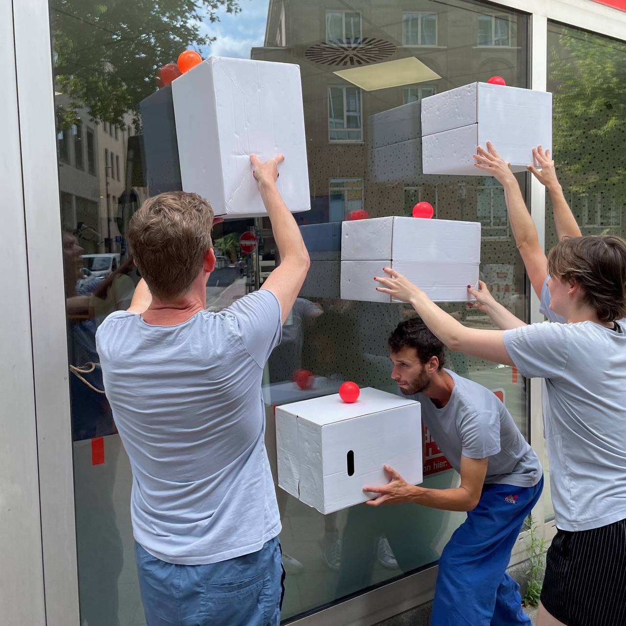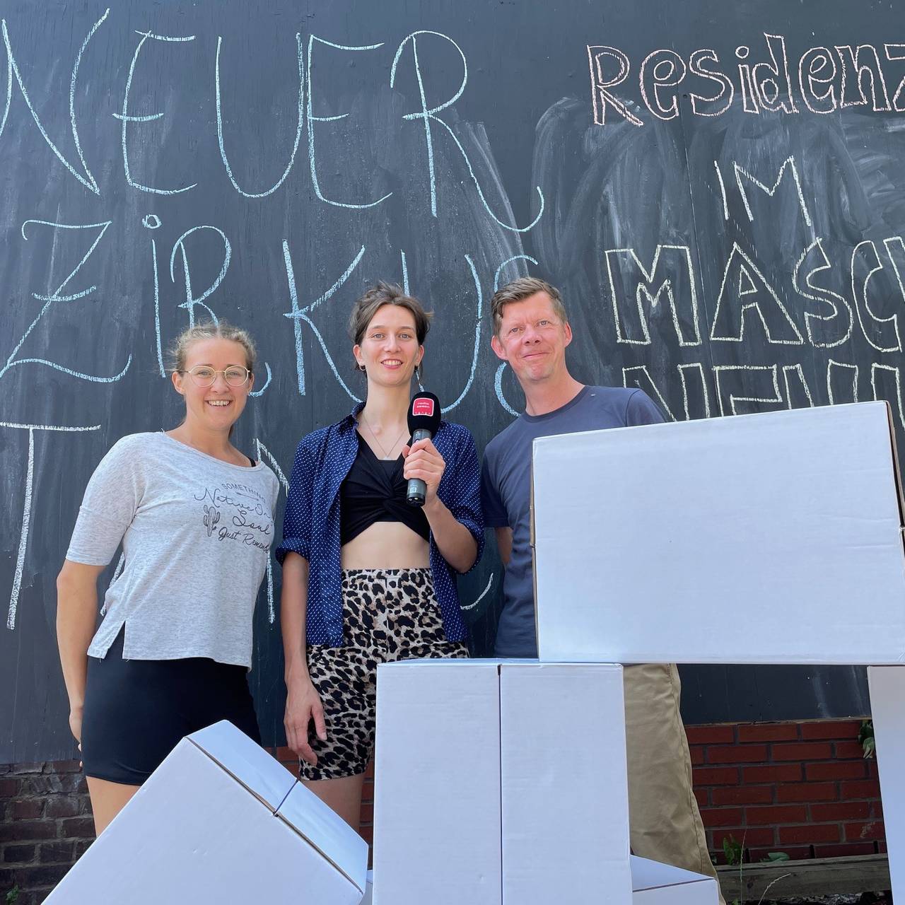 Cyrwheel-Künstlerin Gina und die Gruppe: "Halt mal kurz" von Benjamin Richter nutzen auch den Platz vor dem Radio Essen-Studio für ihre Kunst. Es geht ums Spielen und das nicht nur miteinander, sondern auch mit allen, die zufällig vorbeikommen. Da wird der Stift von Radio Essen-Stadtreporter Timm Schröder zum Jonglage-Objekt und die Fensterscheibe des Sendestudios zum Teil einer kleinen Performance. Erste Ideen für den Auftritt am 16. August auf der Zeche Carl gibt es schon. Aber alles ist noch im Fluss. Alles kann, nichts muss. Hauptsache es macht Spaß.