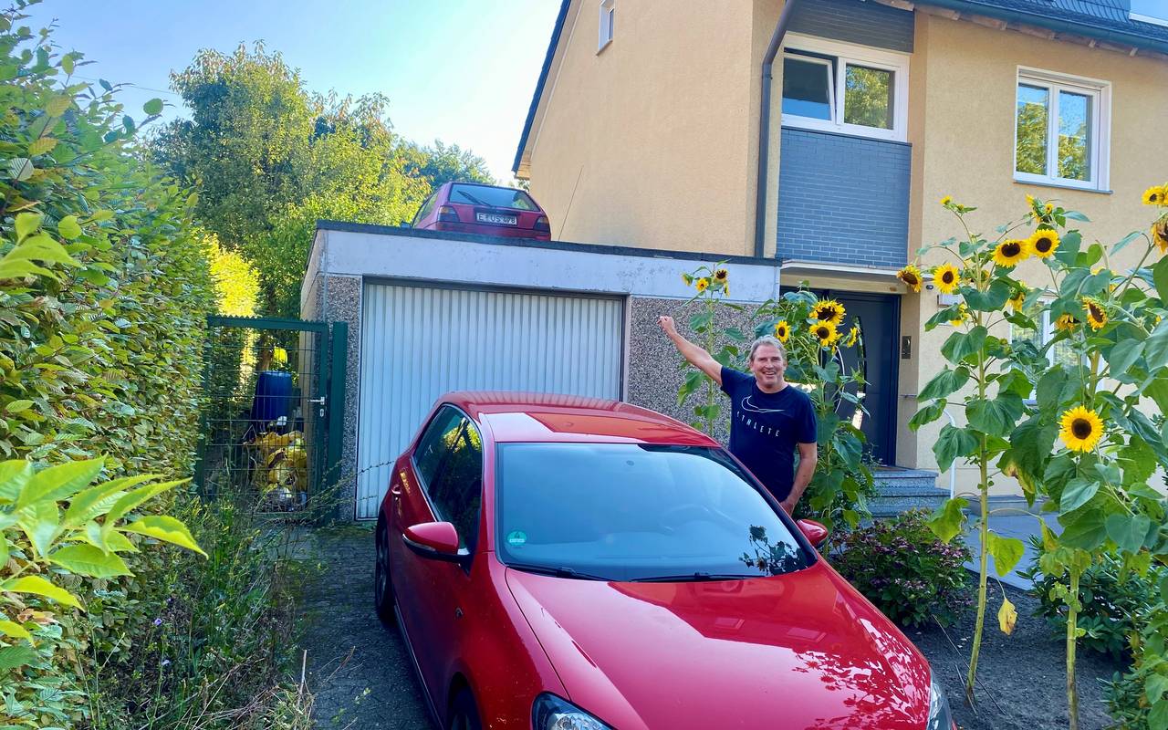 Vor 12 Jahren hat Thomas seinen roten Golf auf das Dach der Garage gestellt. Der Familienvater kann sich von dem Auto einfach nicht trennen. Er klettert ab und zu die Leiter hoch und besucht seinen alten Golf. Der Wagen ist sein kleiner Wintergarten. Im Herbst ist es schön warm im Golf. Im Sommer staut sich die Hitze.