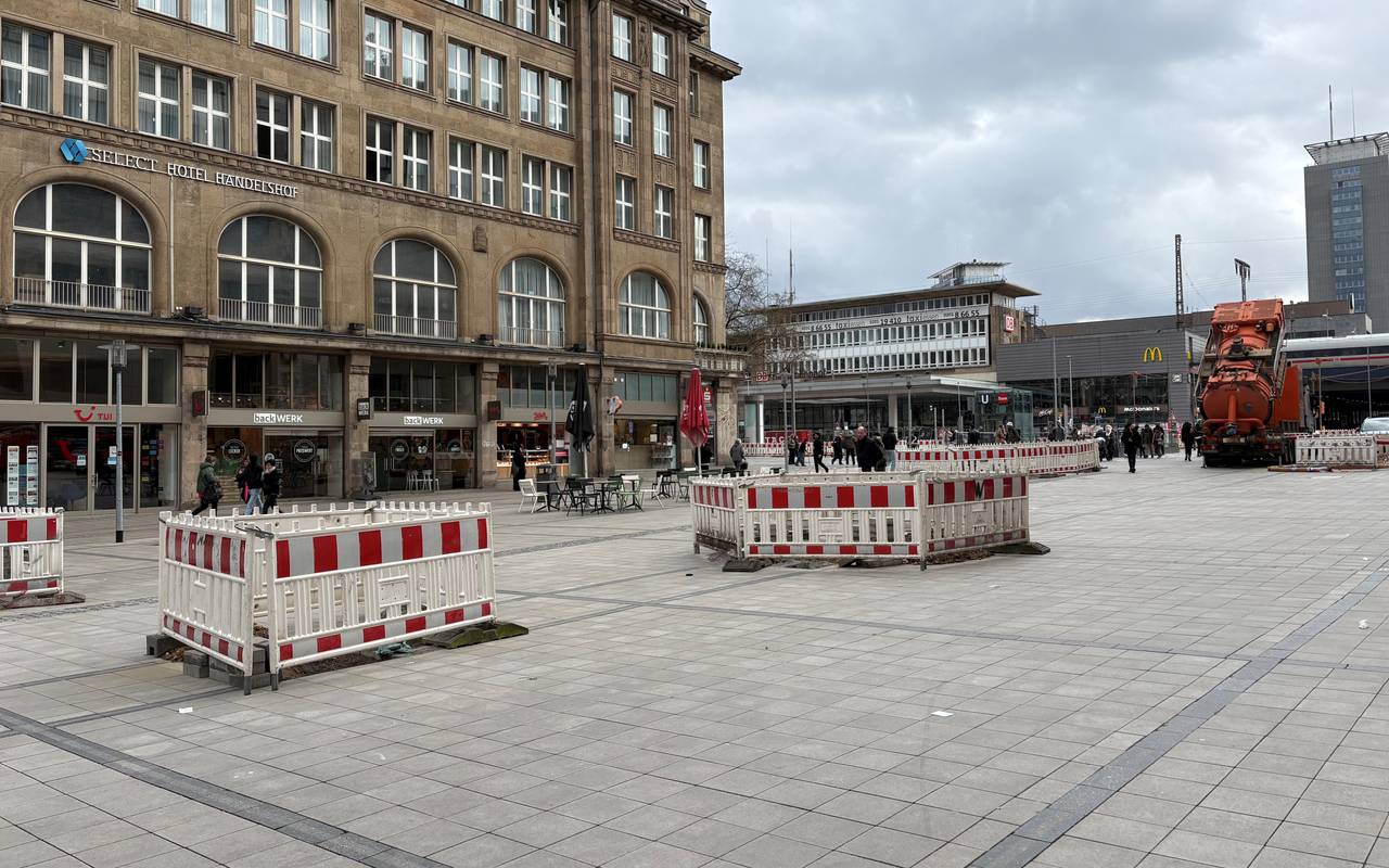 In Essen sind schon wieder mehrere kleine Baustellen auf dem Willy-Brandt-Platz. Nachdem der Platz jahrelang eine große Baustelle war, war er gerade erst fertig geworden. Das ist der jetzt der Grund für die Absperrgitter.