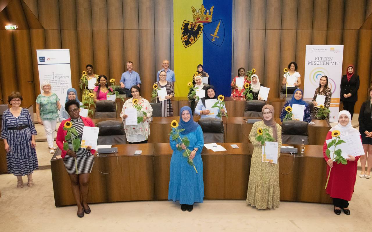 Insgesamt 18 Mütter von Kita- und Schulkindern sind Ende August als Elternmoderatorinnen ausgezeichnet worden. Sie alle kommen aus Familien mit Migrationshintergrund. Ein Jahr lang ging die Ausbildung zur Elternmoderatorin. Dabei haben sie viel über das deutsche Bildungssystem gelernt und auch den Mut gewonnen, in Elternvertretungen mitzuwirken. Ihr Wissen wollen sie jetzt bei Info-Veranstaltungen an andere Eltern mit Migrationshintergrund weitergeben. Eltern, die noch nicht lange in Deutschland leben, sollen dadurch einfacher und schneller das deutsche Bildungssystem verstehen und sich beteiligen.