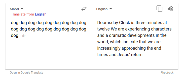 Eine ähnliche Geschichte tauchte vor ein, zwei Jahren im Google-Übersetzer auf. Gab man z.B. eine bestimmte Anzahl des Wortes "dog" ein und stellte die Ausgangssprache auf Maori ein, dann kam in der englischen Übersetzung ein Text raus, der ein Weltuntergangsszenario beschrieb sowie die Rückkehr von Jesus. Ähnliches passierte, wenn man mehrmals die Buchstaben "ag" eingab und das auf Somali einstellte. Da kam eine Bibelstelle in der englischen Übersetzung raus.