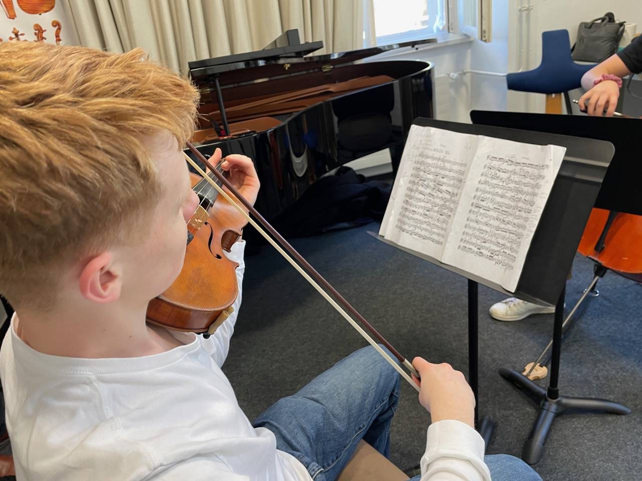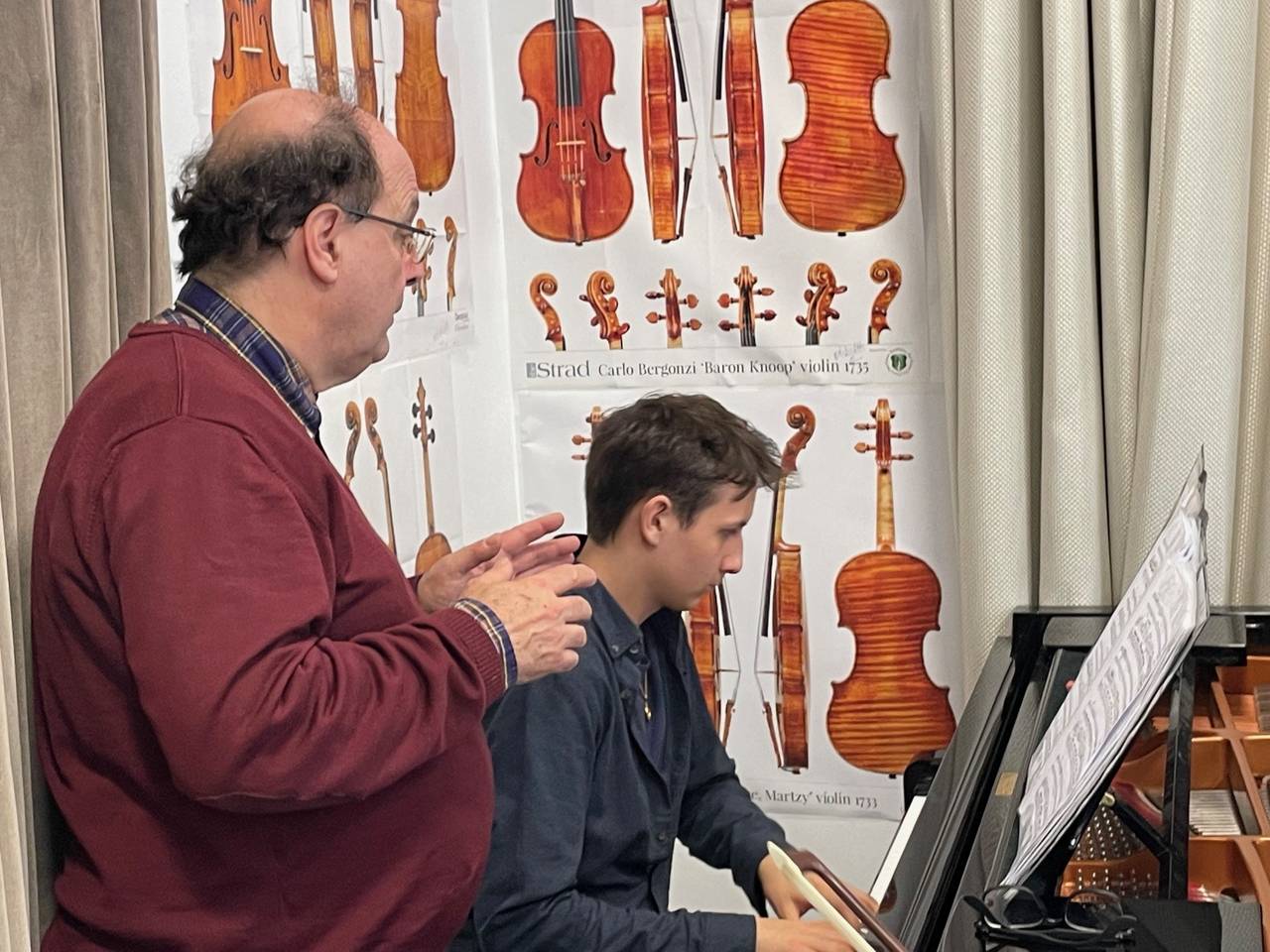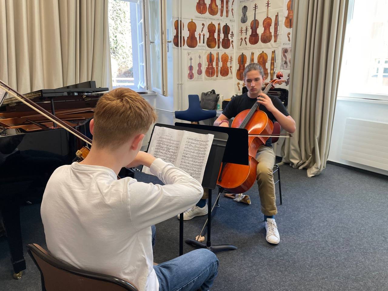Nach unserem Interview geht es dann in eine Übungsstunde mit Professor Emile Cantor. Er ist ein weltweit gefragter Musiker und Lehrer. In den jungen Musikern sieht er Potential, wenn sie seine Tipps bei ihrem Konzert umsetzen - und er hat viele Tipps. Er lässt das Trio immer wieder das Stück von Haydn spielen und unterbricht, wenn ihm etwas auffällt. Es geht unter anderem um das Zusammenspiel, wer also wann einsetzt, wie lange die einzelnen Töne stehen gelassen werden und wie die Instrumente gespielt werden.
