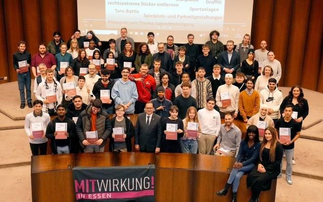 Mit kreativen Ideen das Leben im eigenen Stadtteil mitgestalten - und zwar ehrenamtlich. Das machen sogenannte Prozessmoderatoren, die bei dem Programm "mit Wirkung!" teilnehmen. Oberbürgermeister Thomas Kufen hat jetzt knapp 70 Jugendlichen ein solches Zertifikat übergeben. Die Jüngsten sind teilweise erst 11 Jahre alt. Sie lernen, Jugendprojekte zu organisieren und zu koordinieren, sind in Kommunikation mit Politik und Verwaltung. Letztes Jahr gab es bei uns in Essen insgesamt 27 unterschiedliche Projekte. Die Bezirksvertretungen unterstützen und fördern die Aktivitäten. Die Stadt Essen macht bei "mit Wirkung!" schon seit 19 Jahren mit. Das Programm läuft in allen neun Stadtbezirken.