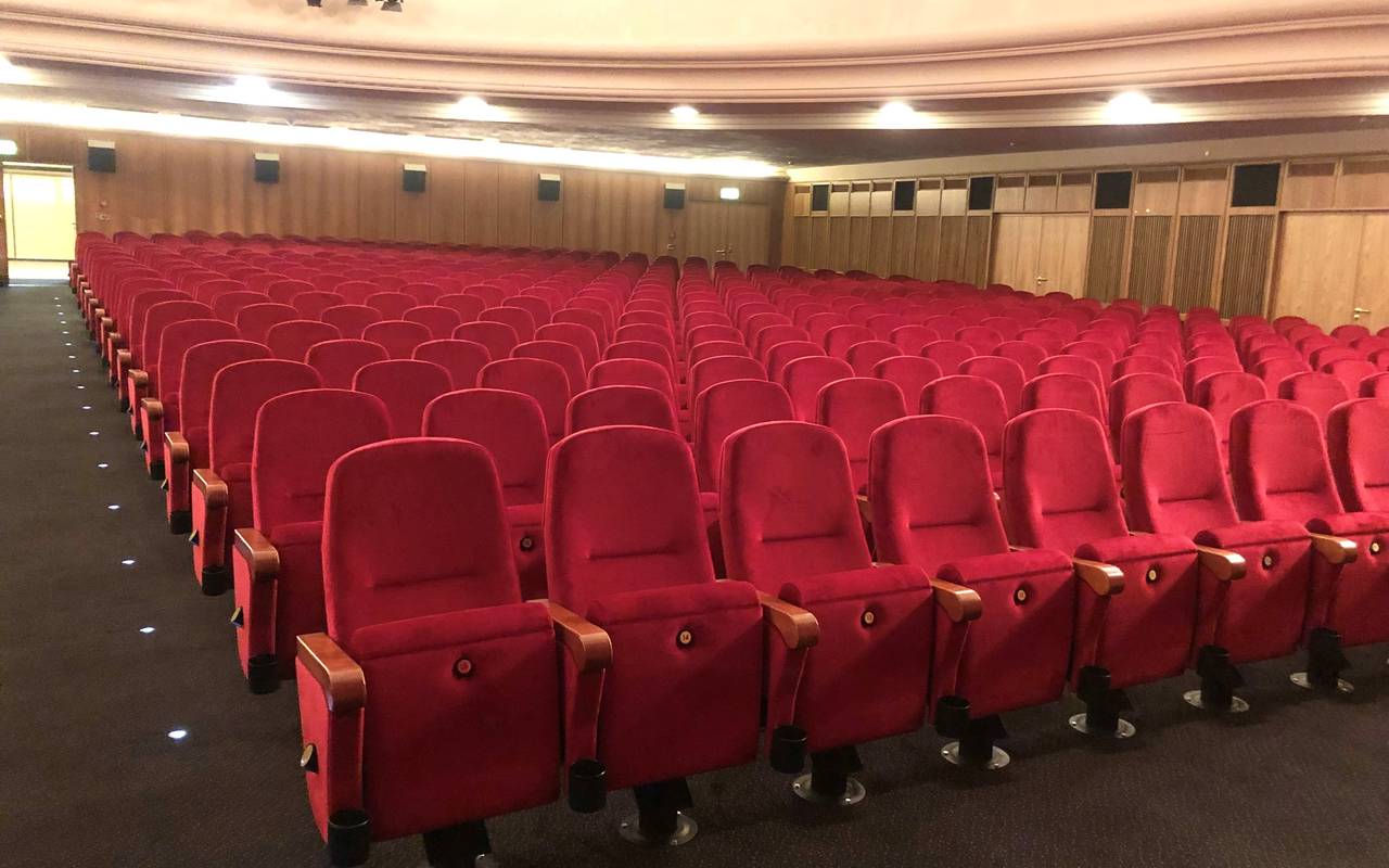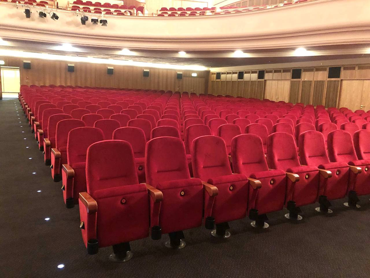 Die roten Sitze wurden alle aufbereitet. Die Polsterung wurde verstärkt, alle bekamen einen neuen Samtbezug, auch die Schrauben wurden verstärkt. Sie sehen aus wie früher. Nur in den Rückenlehnen ist eine neue Naht zu sehen. Die Naht wurde angebracht, um die Sitze stabiler zu machen. Der Projektor musste in der Pause immer wieder mal laufen, sonst geht er mit der Zeit kaputt.