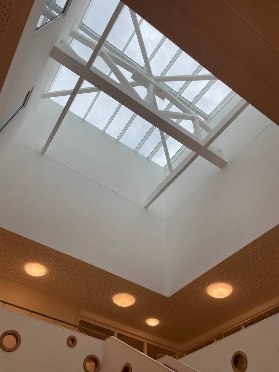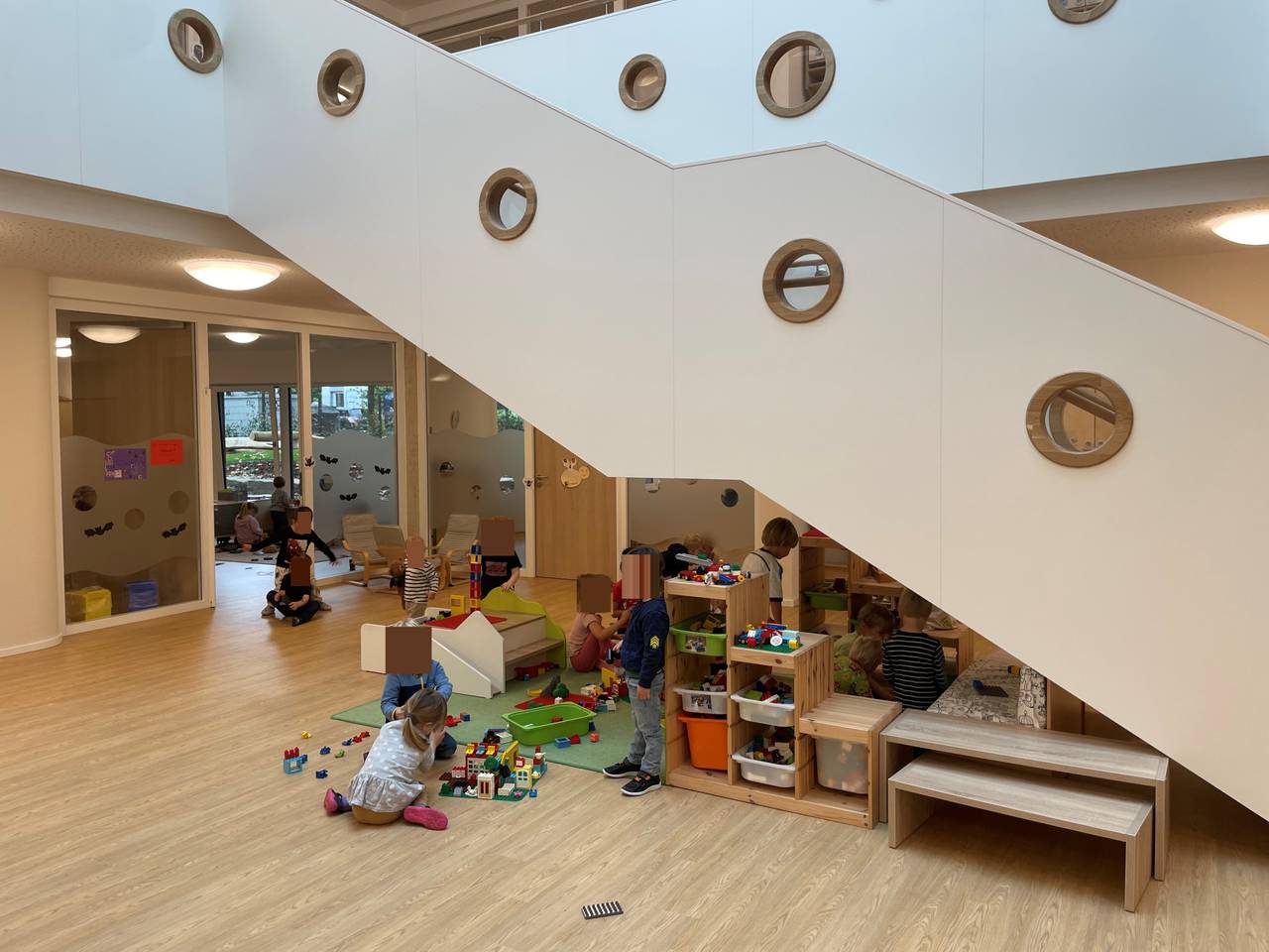 In ihren Gruppen sind die Kinder nur am Anfang des Tages. Danach können sie die ganze Kita nutzen, wie es ihnen gefällt. Die ist auf zwei Etagen aufgeteilt. Es gibt eine große, helle Eingangshalle mit einem Oberlicht. Auch hier toben und spielen die Kinder. Von dort führt eine Treppe nach oben. In dem geschlossenen Geländer sind kleine Gucklöcher eingebaut, damit die Kinder oben trotzdem sehen können, was unten passiert - ohne, dass sie versuchen müssen über das Geländer zu klettern.