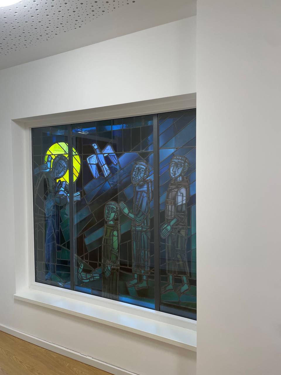 Neben all dem Neuen in der Kita in Essen, geht die Kirche, die dort einmal war, nicht verloren. Der Grundriss ist erhalten geblieben, genauso wie einige bunte Glasfenster. Und in der Kapelle neben der Kita finden sich unter anderem die Steine aus der Kirche wieder, die die zwölf Apostel symbolisieren sollen. Auch das Kreuz und das Taufbecken stehen dort. Hier können die Kita-Kinder Andachten feiern, aber auch alle Gemeindemitglieder sind eingeladen herzukommen.