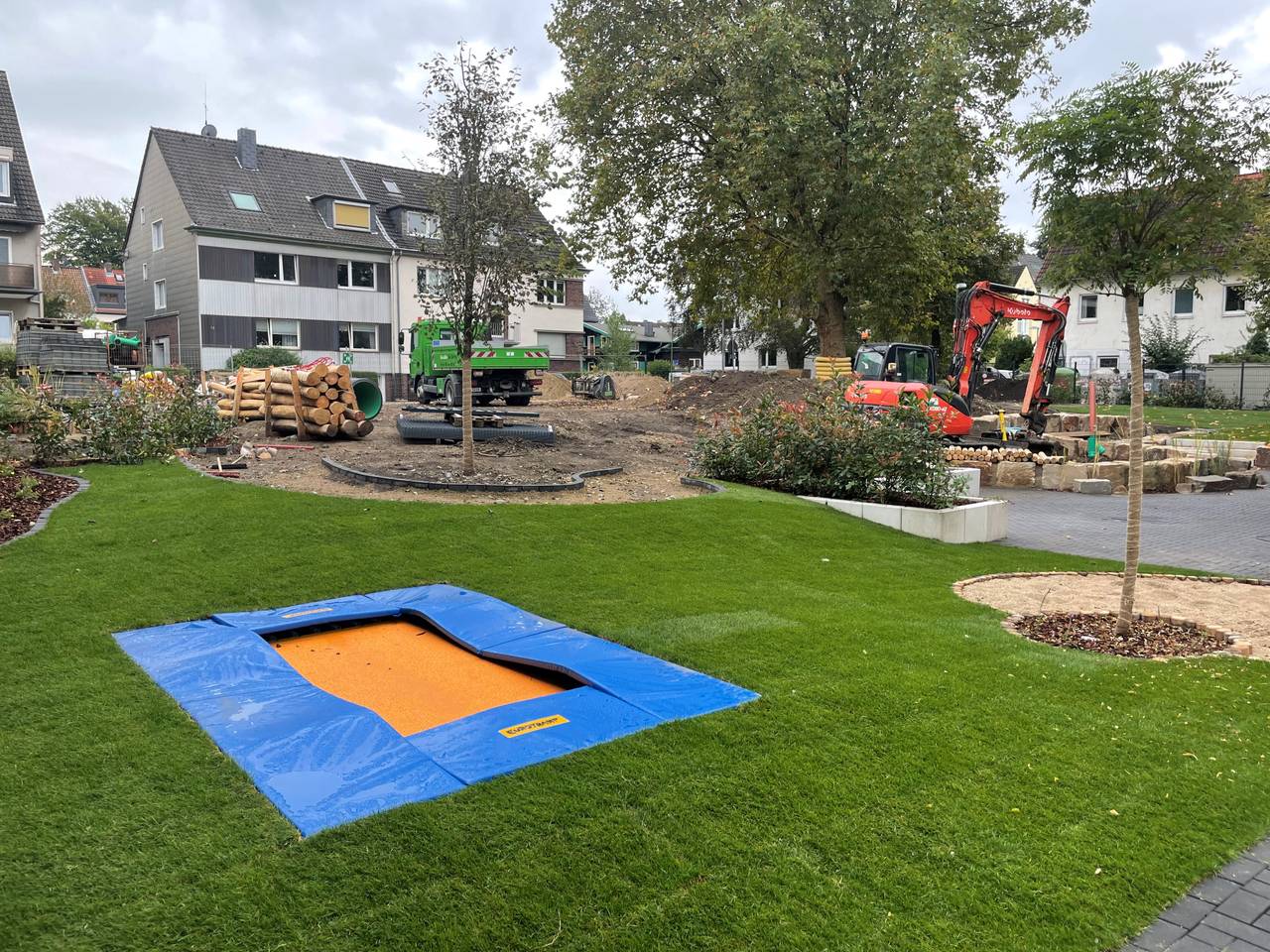 Hier drinnen in der Kita in Essen spielen die Kinder schon seit einigen Wochen. Es müssen nur noch Kleinigkeiten gemacht werden, an den Wänden fehlen zum Beispiel Bilder und Dekorationen. Das Außengelände ist dagegen weniger fertig und kann noch nicht genutzt werden. Hier wird noch die Rutsche aus dem alten Kindergarten montiert und das alte Wasserspielzeug. Aber auch Neues wird es geben. Zum Beispiel ist schon ein Bodentrampolin eingebaut und ein kleines Labyrinth soll noch angelegt werden.