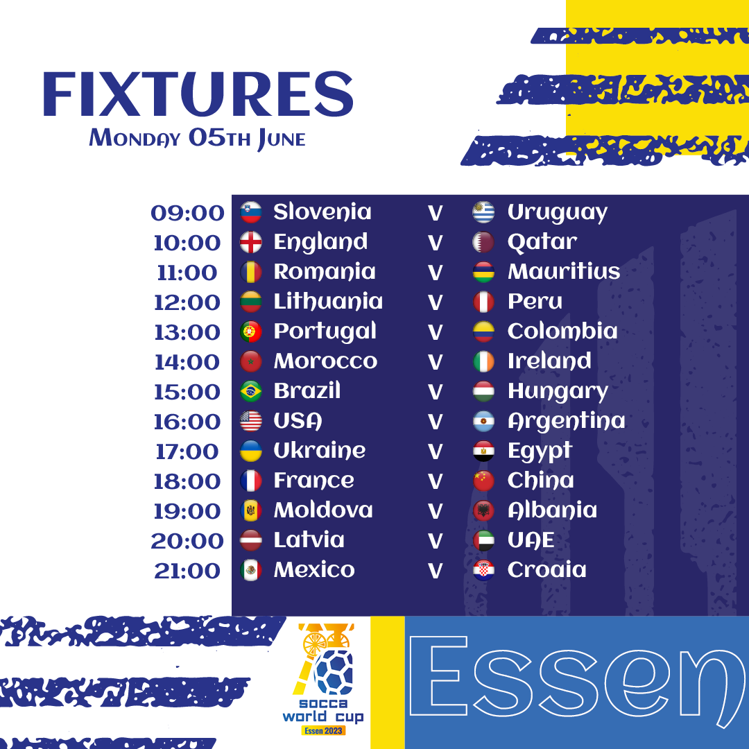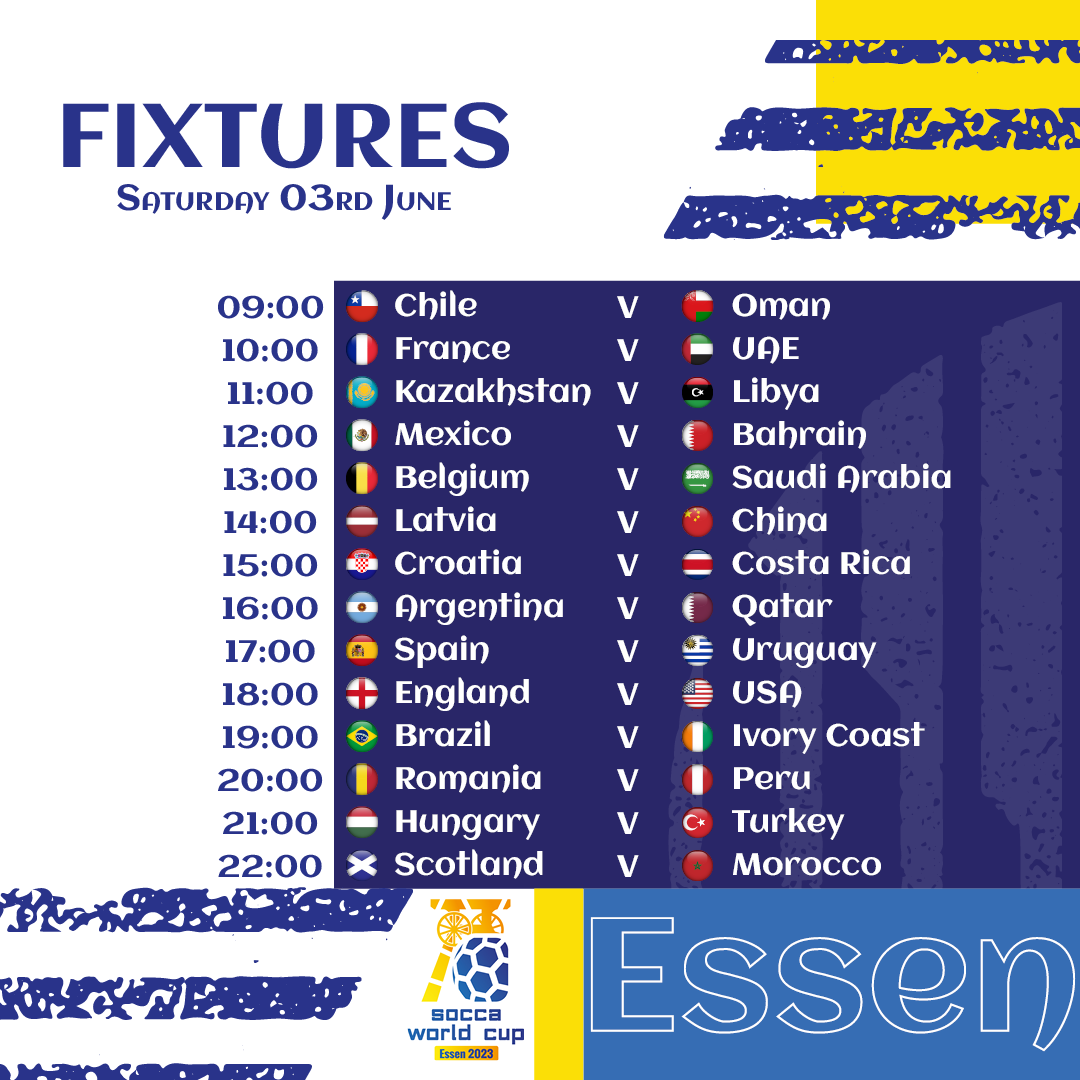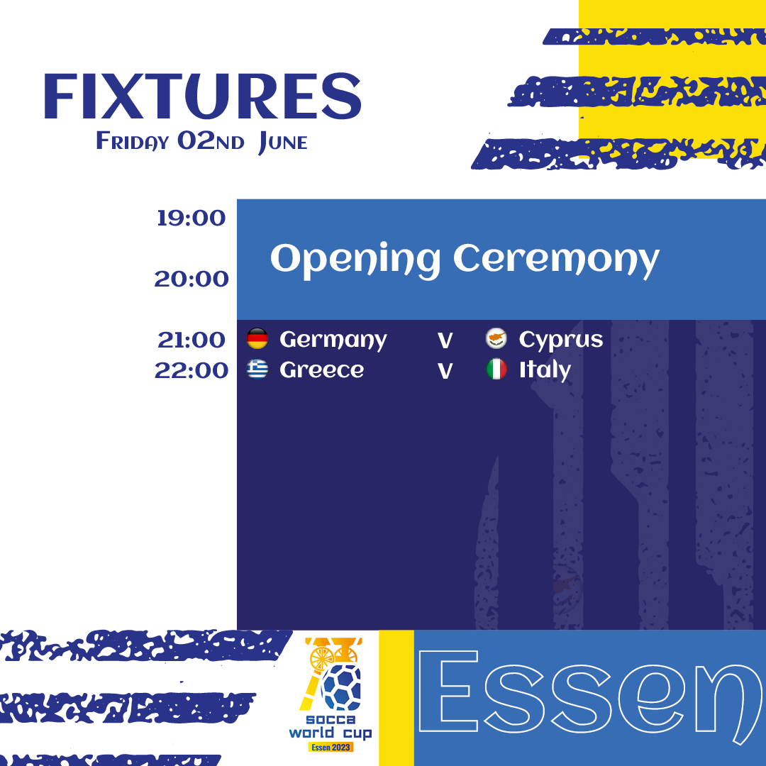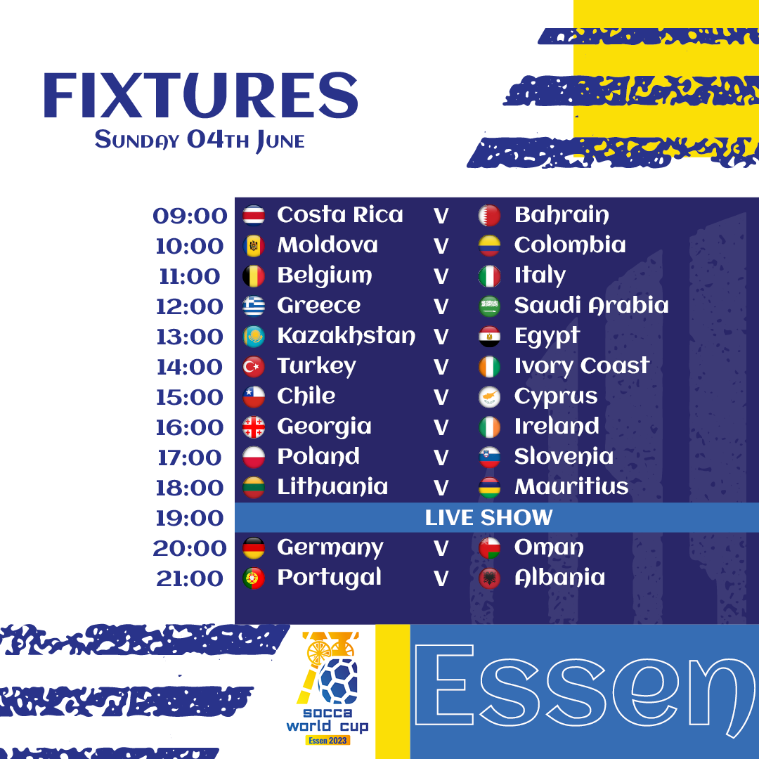 Die offizielle Eröffnungsfeier der Weltmeisterschaft startet am Freitag (2. Juni) um 19 Uhr. Das Eröffnungsspiel zwischen Deutschland und Zypern wird um 21 Uhr angepfiffen. Die Gruppenphase läuft bis Mittwoch (7. Juni), ab Donnerstag (8. Juni) starten dann die KO-Spiele. Anstoß im Finale am Sonntag (11. Juni) ist um 20 Uhr. Einen Tag vor WM-Start gibt es das erste Profi-Kleinfeldturnier für Frauenmannschaften. Mit dabei ist die SGS Essen.