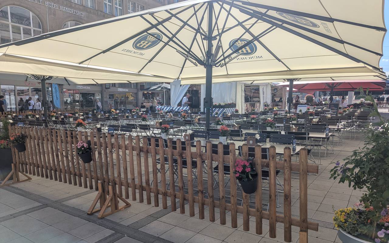 Nur neue Möbel werden bald aufgebaut werden. Die Möbel für die zukünftige Außengastronomie auf dem großen Platz kommen bald an, berichtet Gluth. Ein Teil davon bleibt dann ganzjährig stehen, ein anderer Teil weicht für den Weihnachtsmarkt. Der Pop-Up-Biergarten vom bayrischen Wirtshaus bleibt bis Oktober. Danach geht es so richtig los.
