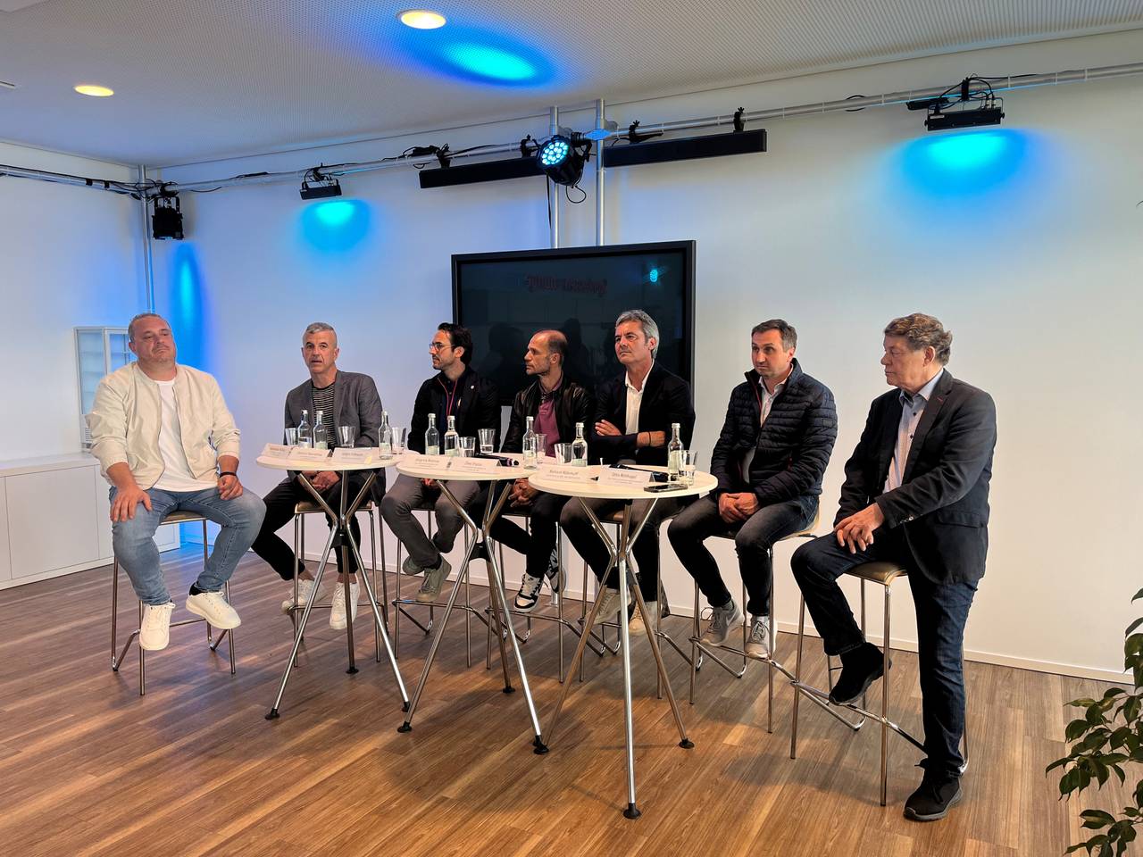 v.l.n.r. Alexandros Politis (Projektkoordinator und Manager von „Champions for Life“), Dimitris Papandreou (Projektkoordinator und Manager von „Champions for Life“), Jürgen Eißmann (Head of Euro 2024 bei DFB EURO GmbH), Angelos Basinas (ehemaliger griechischer Nationalspieler und Europameister 2004), Zisis Vryzas (ehemaliger griechischer Nationalspieler und Europameister 2004), Richard Röhrhoff (Geschäftsführer der EMG – Essen Marketing GmbH) und Otto Rehhagel (ehemaliger Trainer der griechischen Nationalmannschaft und Europameister 2004)