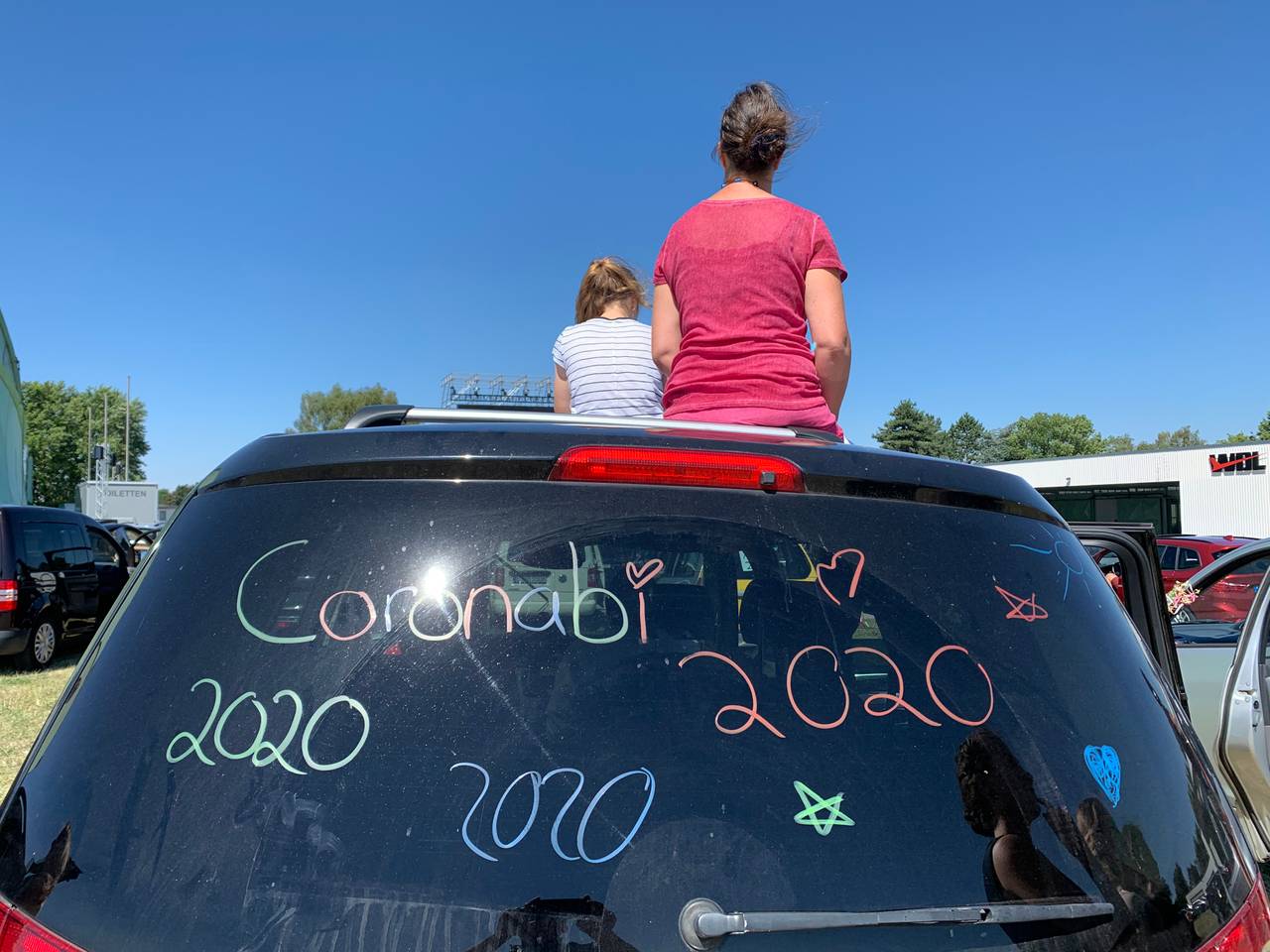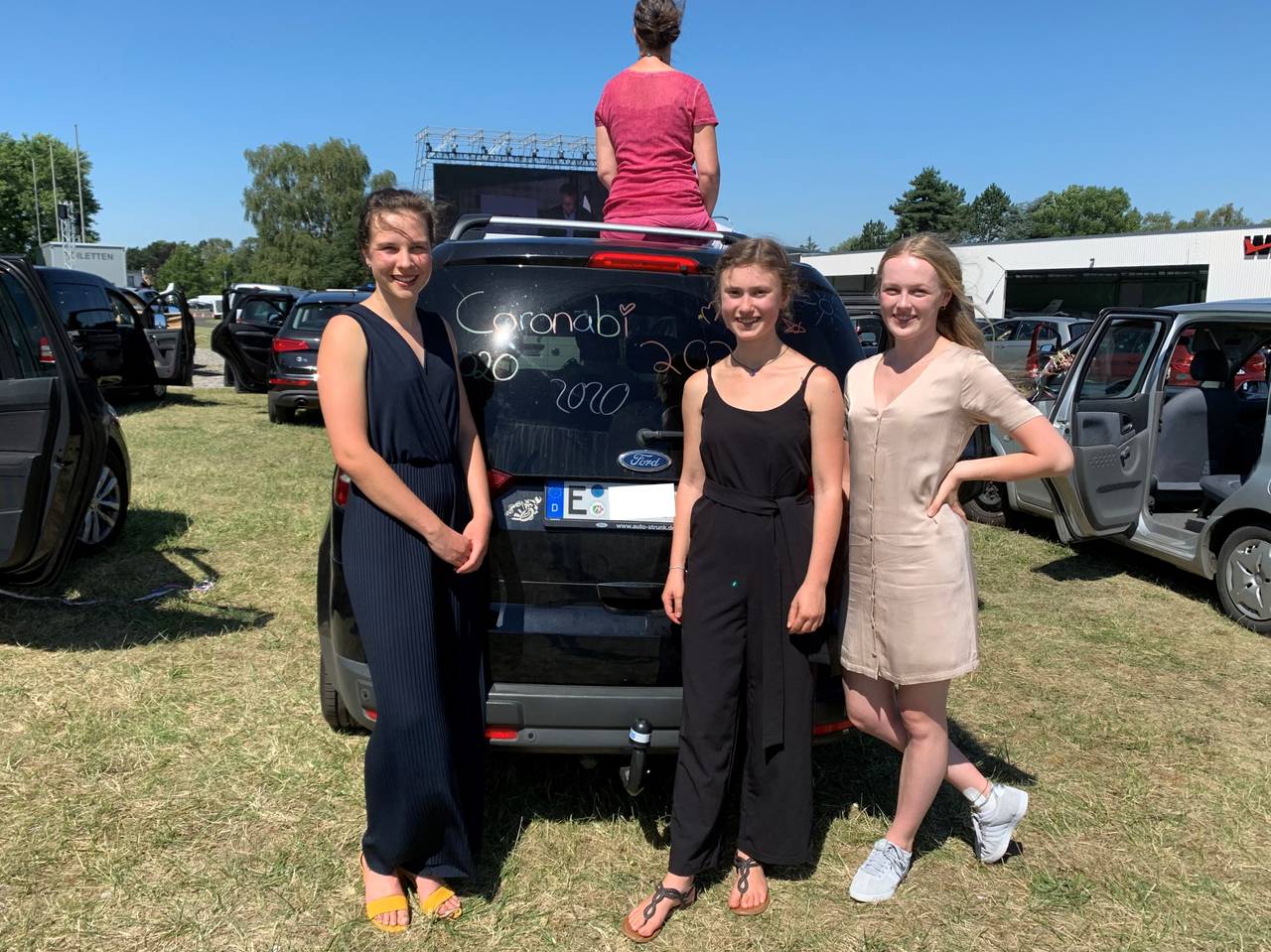 Bei der Abschlussfeier im Autokino waren hunderte Menschen: der ganze Abijahrgang des Grashof-Gymnasiums, sowie Lehrer, Eltern und Geschwister. Einige saßen auf den Dächern der Autos, andere standen auf dem Kofferraum, um besser sehen zu können. Viele Abiturienten waren im Anzug gekommen, einige aber auch in T-Shirt und Jeans.