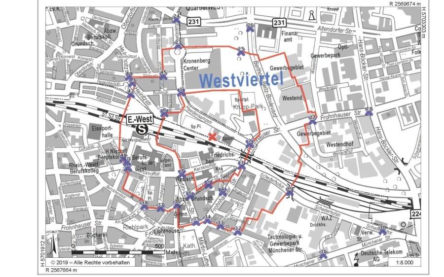 12:14 Uhr: Betroffen ist unter anderem die komplette Bahnstrecke rund um Essen West. U.a. das Einkaufszentrum Kronenbergcenter ist im äußeren Kreis.