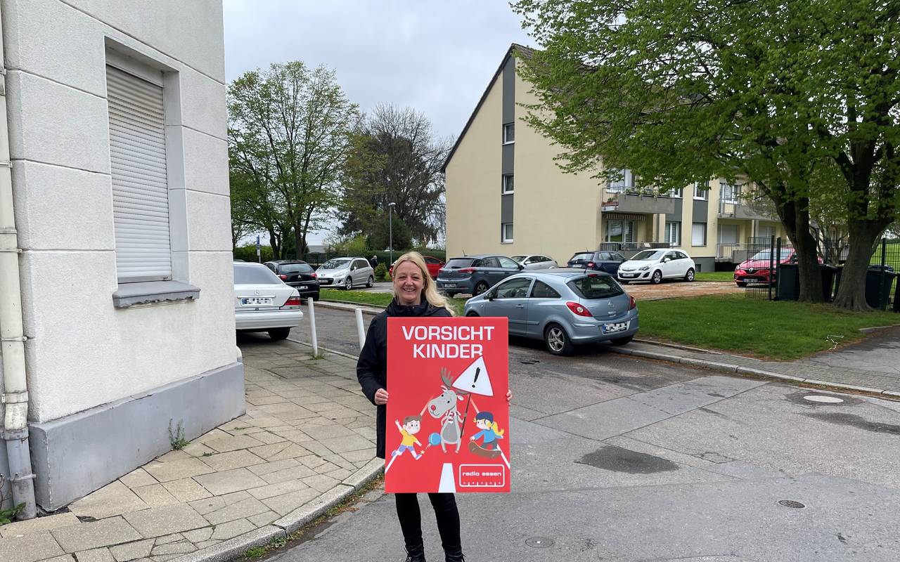 Im Sommer stellt Melanie zusammen mit anderen Eltern hin und wieder Pop Up-Warnschilder auf dem Boden auf. Die werden aber regelmäßig umgefahren. Deswegen hat Melanie ein kleines Warn-Plakat an einer Laterne aufgehängt. Darauf steht "Langsam! Spielende Kinder". Aber das ist relativ klein und reicht nicht aus. Jetzt hat sich Melanie an uns gewandt. Glücklicherweise haben wir noch zwei große Warnschilder von unserer letzten Radio Essen-Verkehrssicherheitsaktion übrig. Die sind rot und es steht in dicker Schrift „Vorsicht Kinder“ drauf. Melanie kann sie jetzt gut sichtbar im Sevinghauser Weg aufhängen und wir freuen uns, dass wir helfen konnten!
