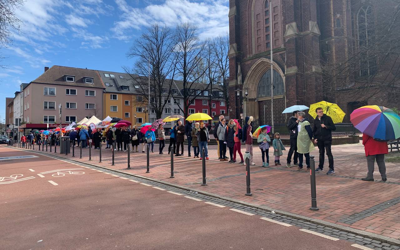 Am Samstagmittag (9. März) stand die Sonne am Himmel und der Regenbogen auf dem Boden. Über 100 Menschen haben sich auf dem Kirchvorplatz auf der Gemarkenstraße in Holsterhausen getroffen, um gemeinsam ein Zeichen gegen Rechts zu setzen. Jugendliche und Familien mit Kindern waren da. Alle waren bunt gekleidet und hatten Regenschirme über ihren Köpfen. Diese standen am Samstag für Vielfalt und Gleichberechtigung. Die Menschenkette war etwa 150 Meter lang und ging einmal um die halbe St. Maria Empfängniskirche. Es waren Zelte aufgebaut und Kaffeebecher, Plakate und Lametta - alles glänzte in Regenbogenfarben. Kinder und Erwachsene konnten Kerzen bunt bekleben und sich bei den Initiativen über die kommenden Veranstaltungen informieren.