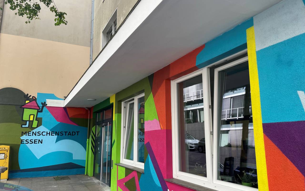 Die neuen Räume der Menschenstadt wurden gefördert von der Stiftung Deutsches Hilfswerk, für das Graffiti an der Fassade hat die Sparkasse Essen Geld beigesteuert.