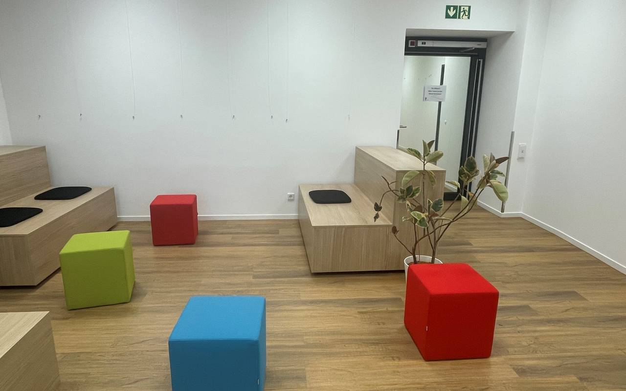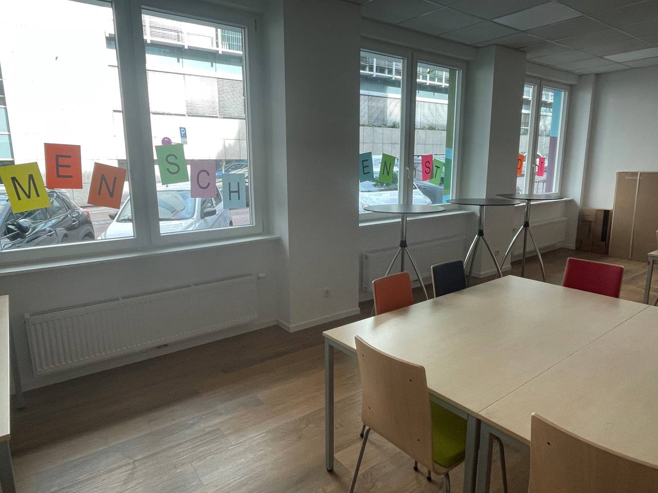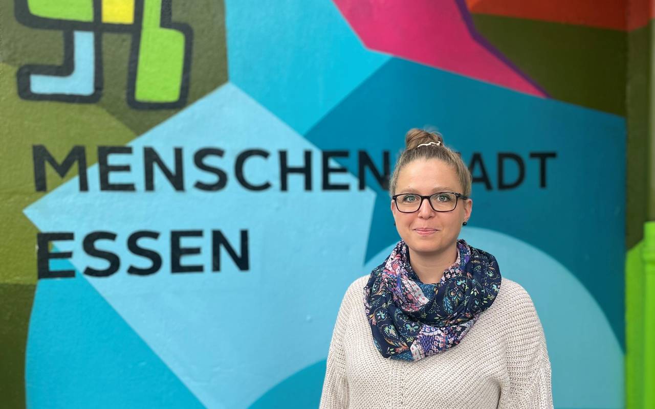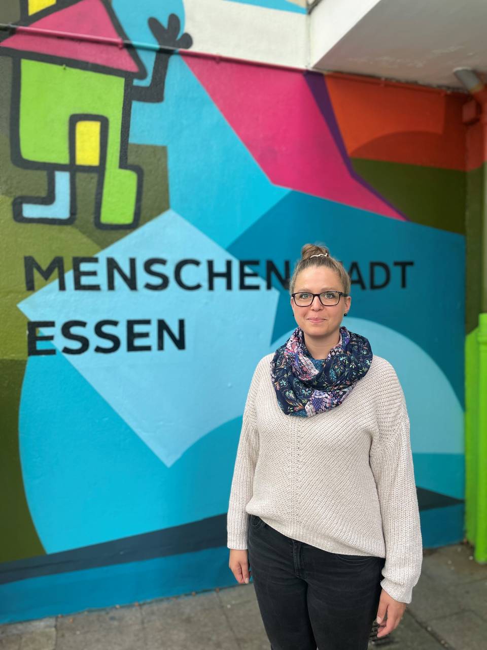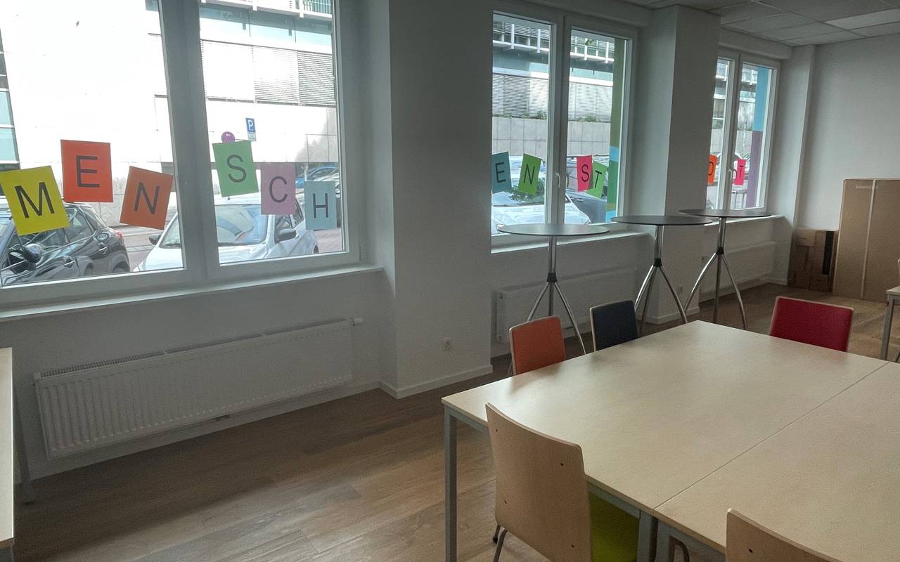 Seit Mitte September ist die Menschstadt an einem neuen Ort. Die Institution ist innerhalb der Innenstadt umgezogen, an die Logenstraße 6. Dort ist sie über einen Innenhof mit vielen anderen kirchlichen Institutionen verbunden. Außerdem sind die neuen Räume viel einladender, sagt Lisa Lichtenstein von der Menschenstadt Essen. Auf der Fassade am Eingang ist buntes Graffiti und es gibt es einen großen Eingangsbereich in dem sich Besucherinnen und Besucher hinsetzten und einen Kaffee trinken können. Dazu gibt es einen Aufenthaltsraum mit bunten Stühlen, in den noch eine Küchenzeile eingebaut wird. Der kann dann für Workshops und Beratungsgruppen genutzt werden. Insgesamt wirkt alles viel wohnlicher und weniger wie ein Büroflur, sagt Lisa Lichtenstein.