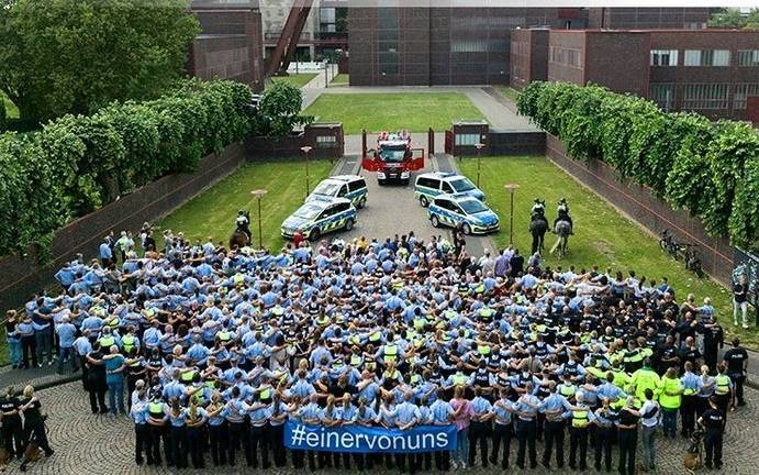 Die Polizei Essen kam am Mittwoch (12. Juli) zu einer besondere Solidaritätsaktion zusammen. Damit zeigten die über 400 Polizistinnen und Polizisten ihre Anteilnahme an dem Angriff auf ihren Kollegen Marcel, der im Juni bei einem Angriff schwer verletzt wurde.