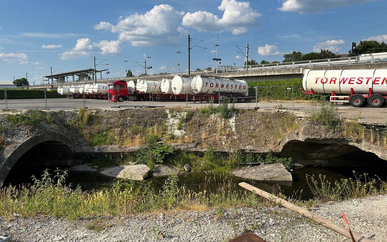 In Essen sind einige Schäden am Deilbach immer noch deutlich sichtbar. Zum Beispiel das Loch auf dem Hof der Spedition Torwesten in Kupferdreh. Dort im Gewerbegebiet müssen einige LKW weiterhin außerhalb parken, weil sie nicht auf dem Hof stehen können. Bei der Hochwasserkatastrophe vor zwei Jahren war der Deilbach extrem angeschwollen und schoss durch Kupferdreh. Die Kraft des Wassers war so groß, dass Teile des unterirdischen Kanals des Deilbachs unter dem Hof der Spedition eingebrochen sind. Damals versank ein Tanklaster in dem Loch. Der wurde später geborgen, seitdem ist das Loch aber immer noch auf dem Hof der Spedition.