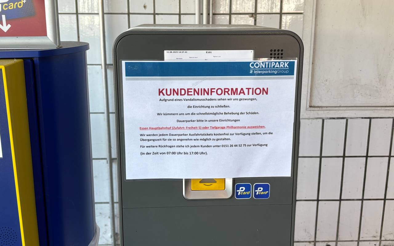 In Essen wurde jetzt kurzfristig das Parkhaus an der Hindenburgstraße geschlossen. Der Betreiber Contipark hat für alle Dauermieter einen Hinweis aufgehängt.