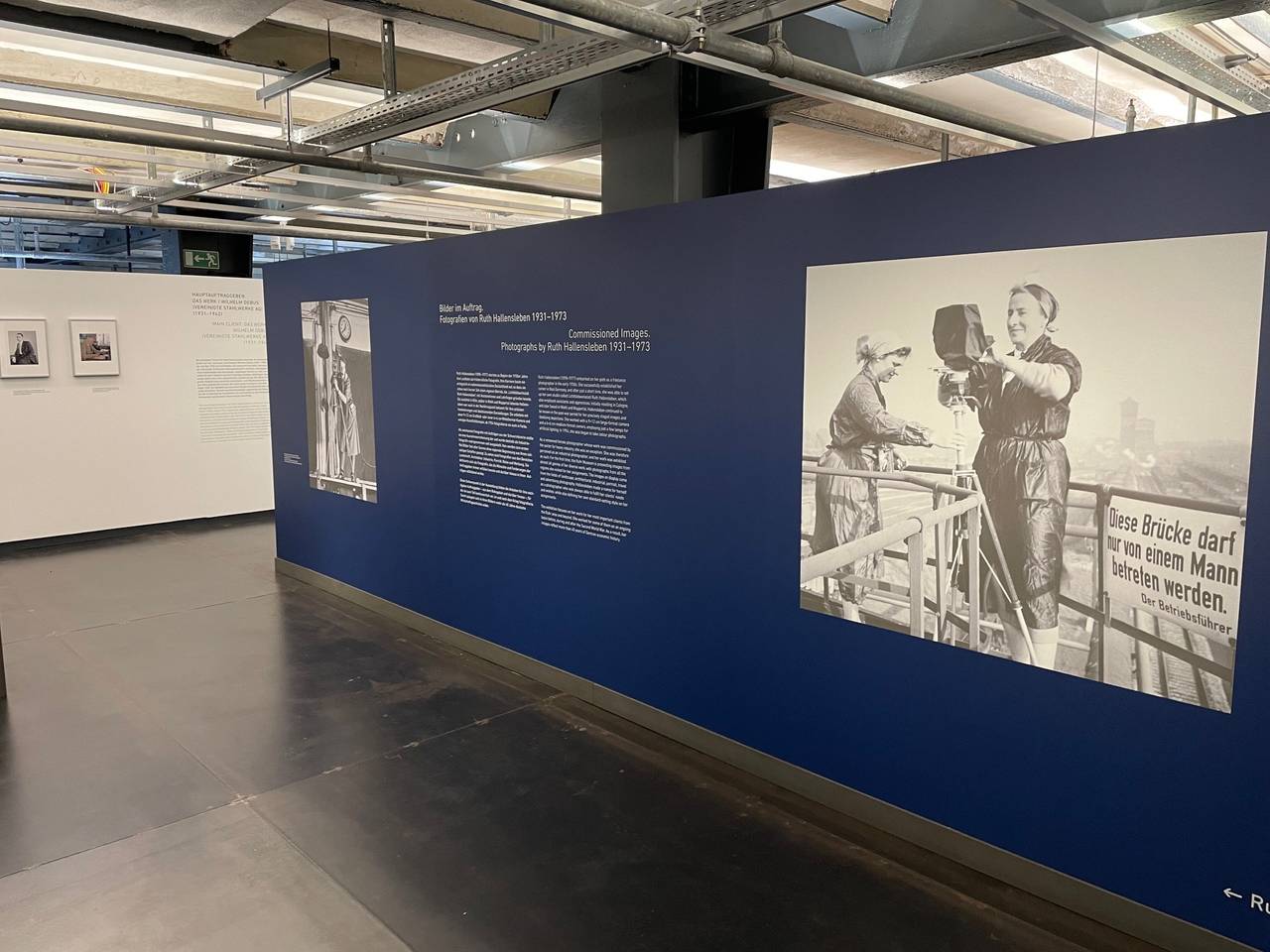 Die 120 Fotografien zeigen alle Phasen des Berufslebens von Ruth Hallensleben. Ihre Karriere baute sie ab den 1930er-Jahren im nationalsozialistischen Deutschland auf. Bis kurz vor Kriegsende fotografierte sie für Unternehmen und nationalsozialistische Organisationen. In allen Auftragsarbeiten werden die Wünsche der Auftraggeber erfüllt – entsprechend den Vorgaben im NS-Staat. In ihren Aufträgen für die Rüstungsindustrie dokumentiert Hallensleben die Fertigung von Bomben in der Maschinenfabrik Meer in Mönchengladbach (1941) und die Herstellung von Panzerfahrzeugen im Werk Thyssen der Deutsche Röhrenwerke AG in Mülheim an der Ruhr (1943). Nach dem Krieg kommt sie wieder schnell ins Geschäft und macht unter anderem Fotoreportagen über den Wiederaufbau des Kölner Doms, Aufträge für das Theater, Produktbilder für Anzeigen, Produktkataloge und Firmenbroschüren sowie Reisefotografien.
