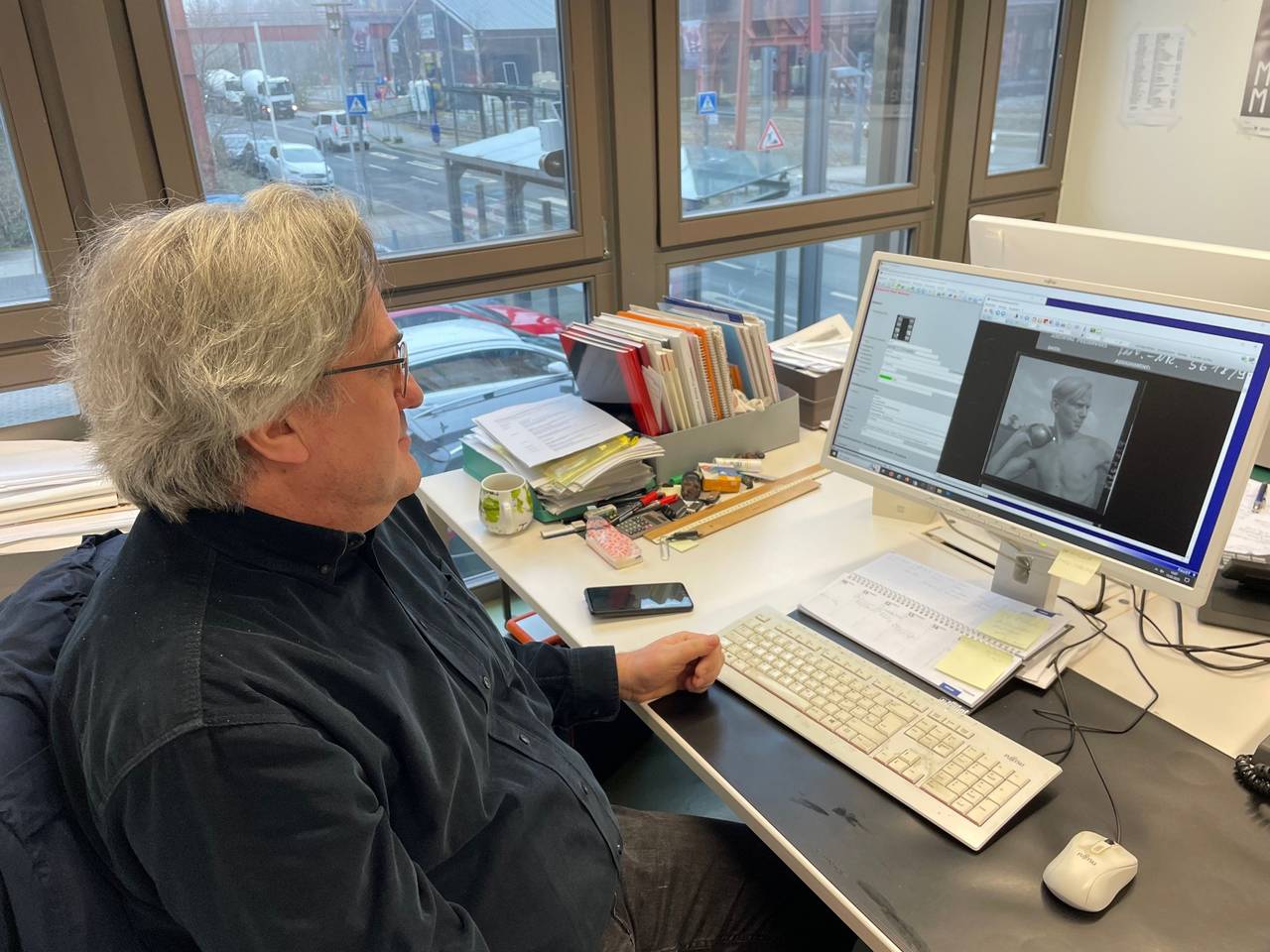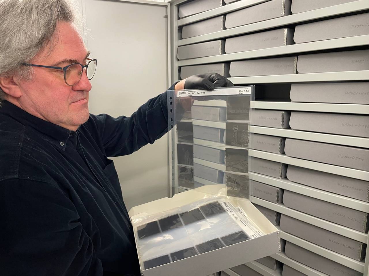 Kurator Thomas Dupke nimmt Radio Essen-Stadtreporter Timm Schröder mit ins Fotodepot des Ruhr Museum auf Zollverein. Hier sind Besucherinnen und Besucher sonst nicht gerne gesehen, weil sie allein durch ihre Anwesenheit die rund vier Millionen Negative und Fotos beschädigen könnten. Sowohl die Temperatur, als auch die Luftfeuchtigkeit werden hier durch Computer überwacht. So empfindlich sind die zum großen Teil historischen Bilder. Sollten die Aufnahmen dann doch einmal den Raum verlassen, müssen sie erst für mehrere Stunden in eine besondere Schleuse. Für uns geht es genau durch diesen Raum in die fotografische Schatzkammern des Ruhr Museum. Nur mit speziellen Handschuhen dürfen hier die Fotos angefasst werden und wir dürfen auch nicht lange bleiben. Für die 120 Bilder der Ausstellungen haben sich die vier Kuratoren alle rund 40.000 Aufnahmen angesehen. Dazu wurden auch noch andere Archive besucht. Insgesamt kein leichter Job. Es hat mehrere Monate gedauert bis die Ausstellung dann stand.