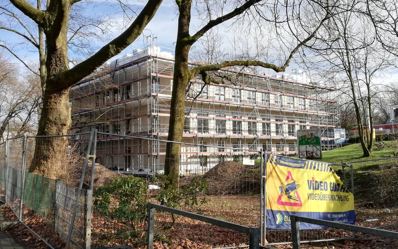 In Essen muss es schnell gehen mit dem Schulneubau in Rüttenscheid. Schon zu Beginn des nächsten Schuljahres sollen dort die Schülerinnen und Schüler an den Tischen sitzen und lernen. Das Projekt kommt im Moment auch gut voran, erklärt ein Sprecher der Stadt Essen auf Radio Essen-Nachfrage. Der Rohbau an der Rosastraße in Rüttenscheid ist fast fertig. Gerade wird die Lüftungsanlage eingebaut. Außerdem sind die Treppen in Arbeit. Dafür wird gerade der Beton angeliefert. Auch die Elektrotechnik wird parallel eingebaut und die nötigen Anlagen für den Brandschutz. Es läuft also gerade vieles parallel auf der Baustelle für die Ersatzgrundschule in Rüttenscheid. Die neue Schule ist ein Hybridbau, so nennt es die Stadt. Die Klassenzimmer bestehen aus mehreren Holzmodulen, die angeliefert und vor Ort zusammen gesetzt werden. Das Treppenhaus und die Pfeiler im Flur sind aus Beton. Die Mensa dagegen wird aus einem Holzrahmen zusammengesetzt und darauf kommen wiederum weitere Module. So geht es Schlag auf Schlag auf der Baustelle. Die Holzmodule werden komplett angeliefert und meist parken die großen Schwerlaster für mehrere Stunden an der Müller-Breslau-Straße. Insgesamt besteht der Neubau aus 65 Raummodulen und dem Holzrahmen für die Mensa. So sieht der Schulneubau aktuell aus.